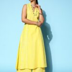Add a twist to your everyday style with this chic and versatile kurta set. The alluring V-neck and sleeveless design of this kurta set promises to elevate your appeal.