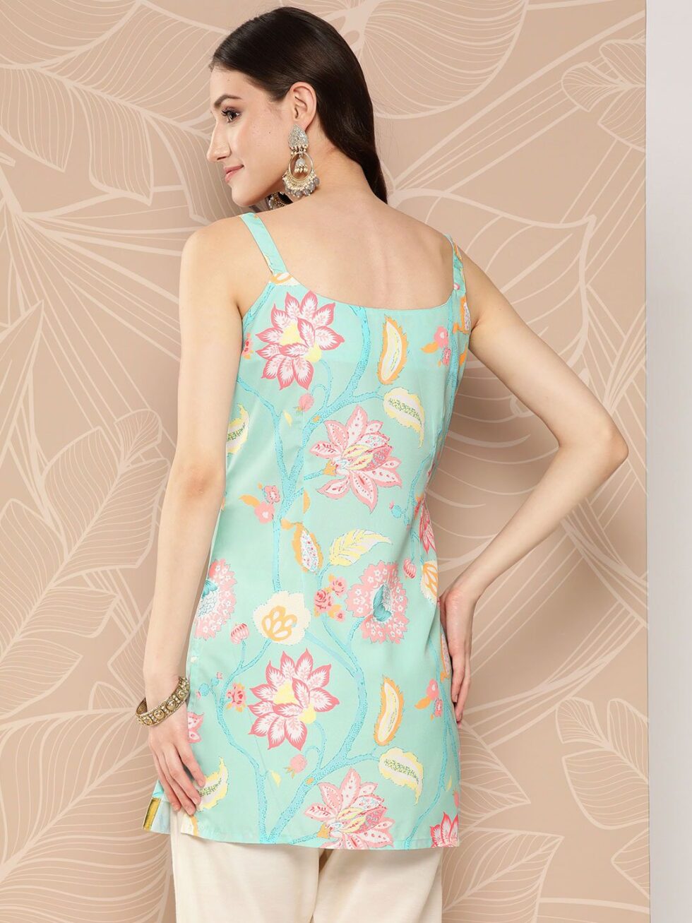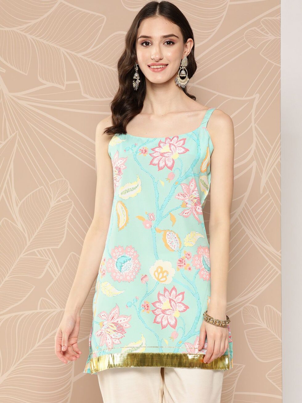 Blue printed tunic ,has a shoulder straps, sleeveless, embellished detail,