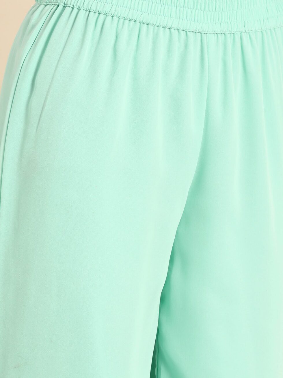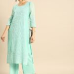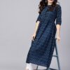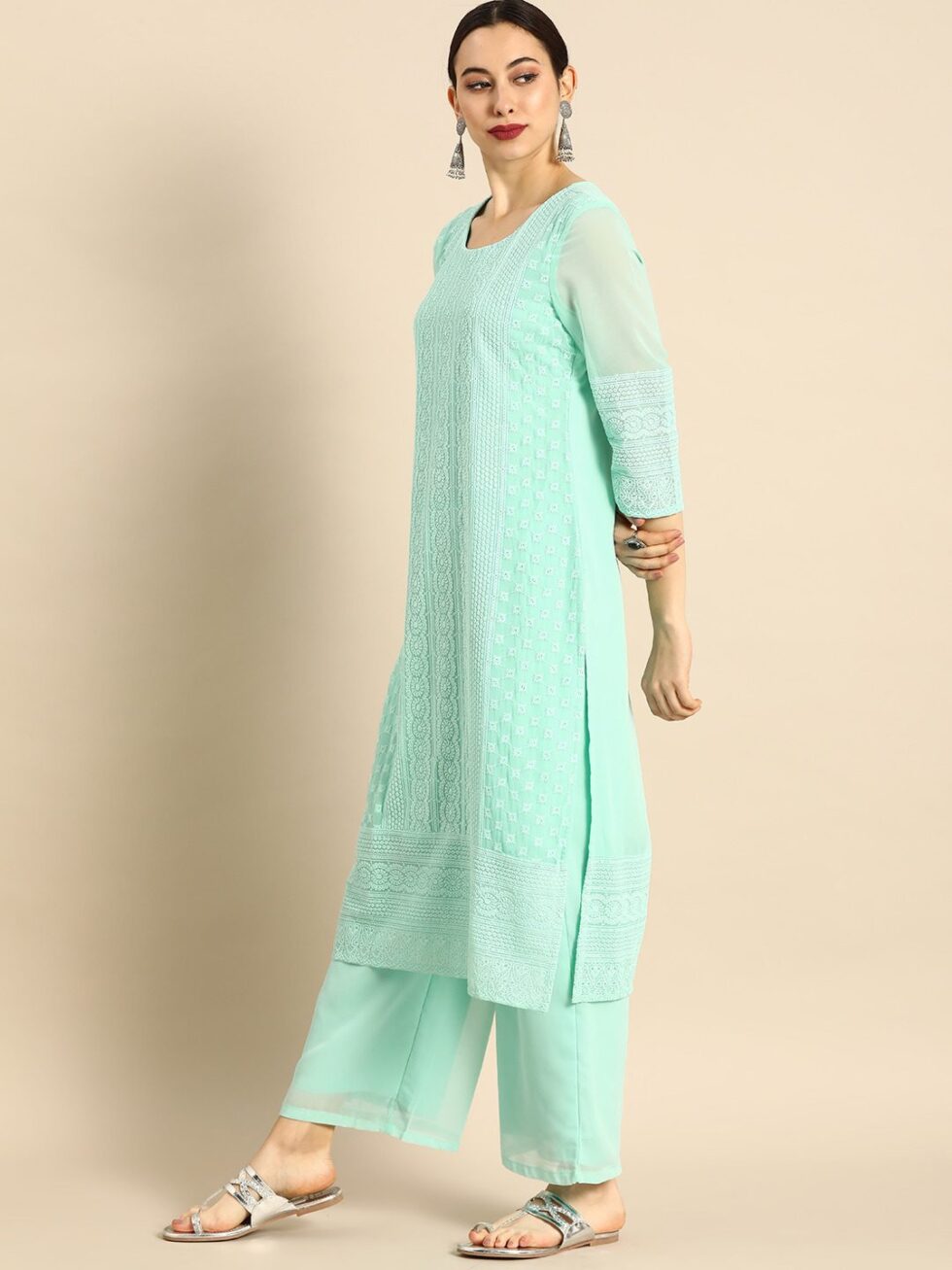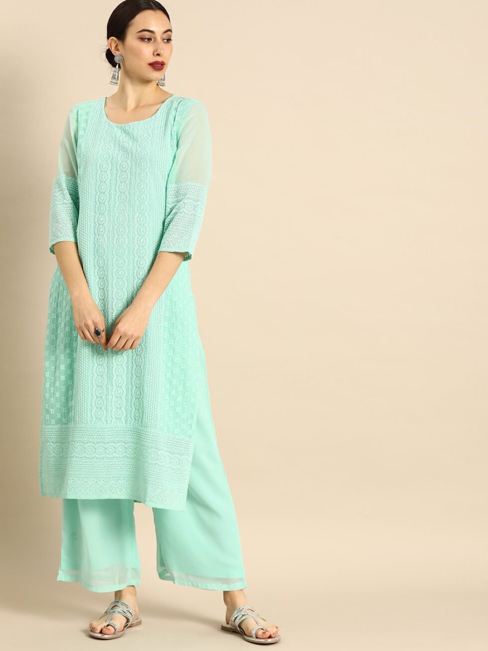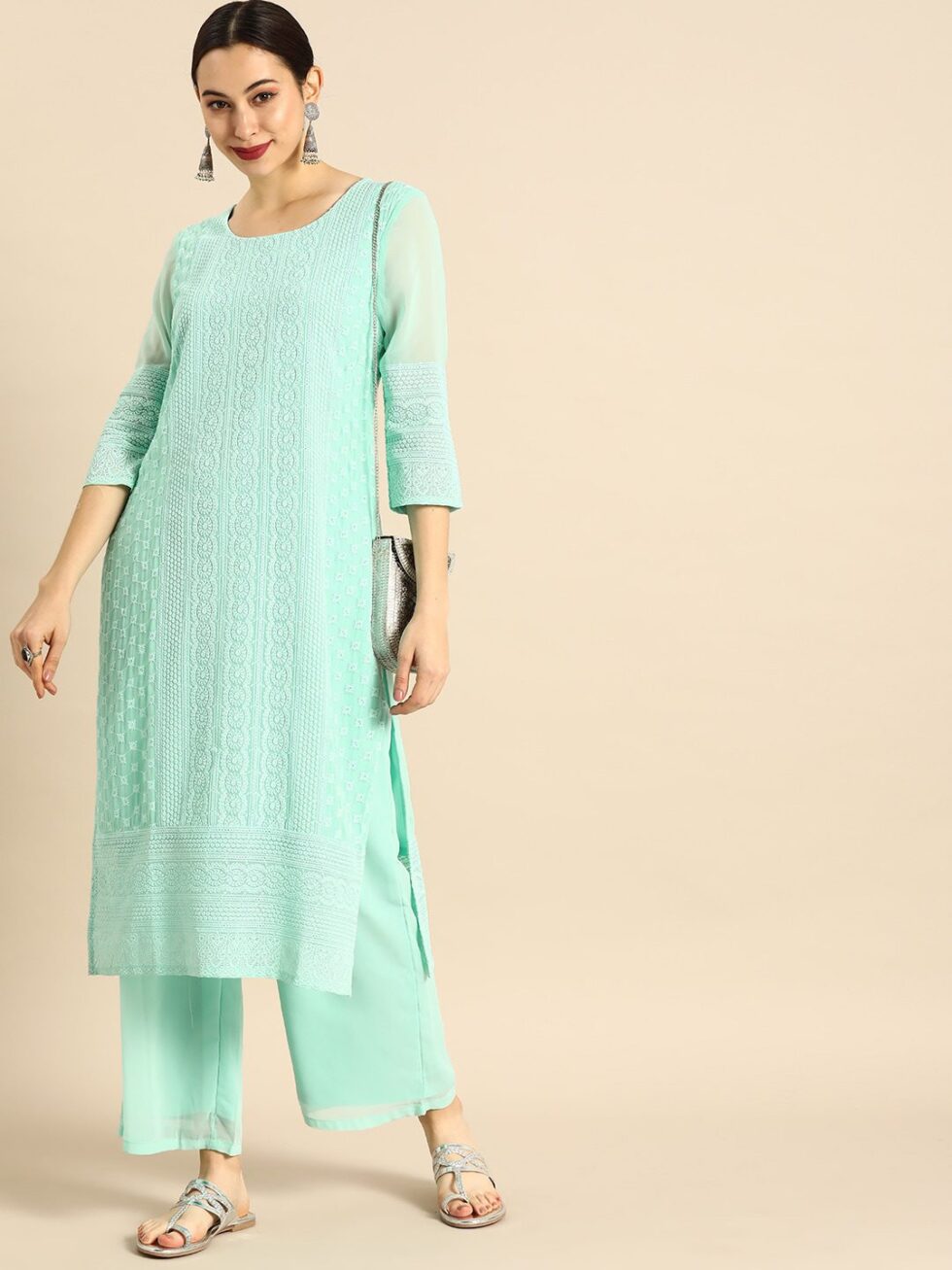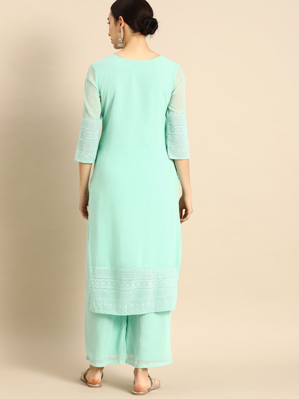 Blue embroidered kurta with palazzos Blue straight calf length kurta, has a round neck, three-quarter sleeves, side slits Blue Solid palazzos, has elasticated waistband