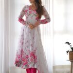 Pair it with the pink cotton silk pant for a unique and stylish look that will surely turn heads. Accessorize this beautiful white anarkali suit with the matching organza dupatta, also adorned with floral print work, to complete your outfit.