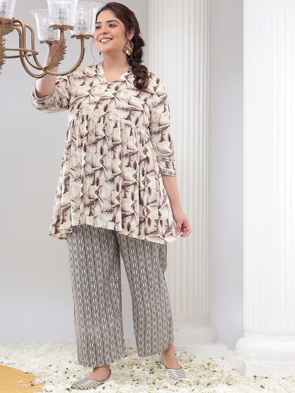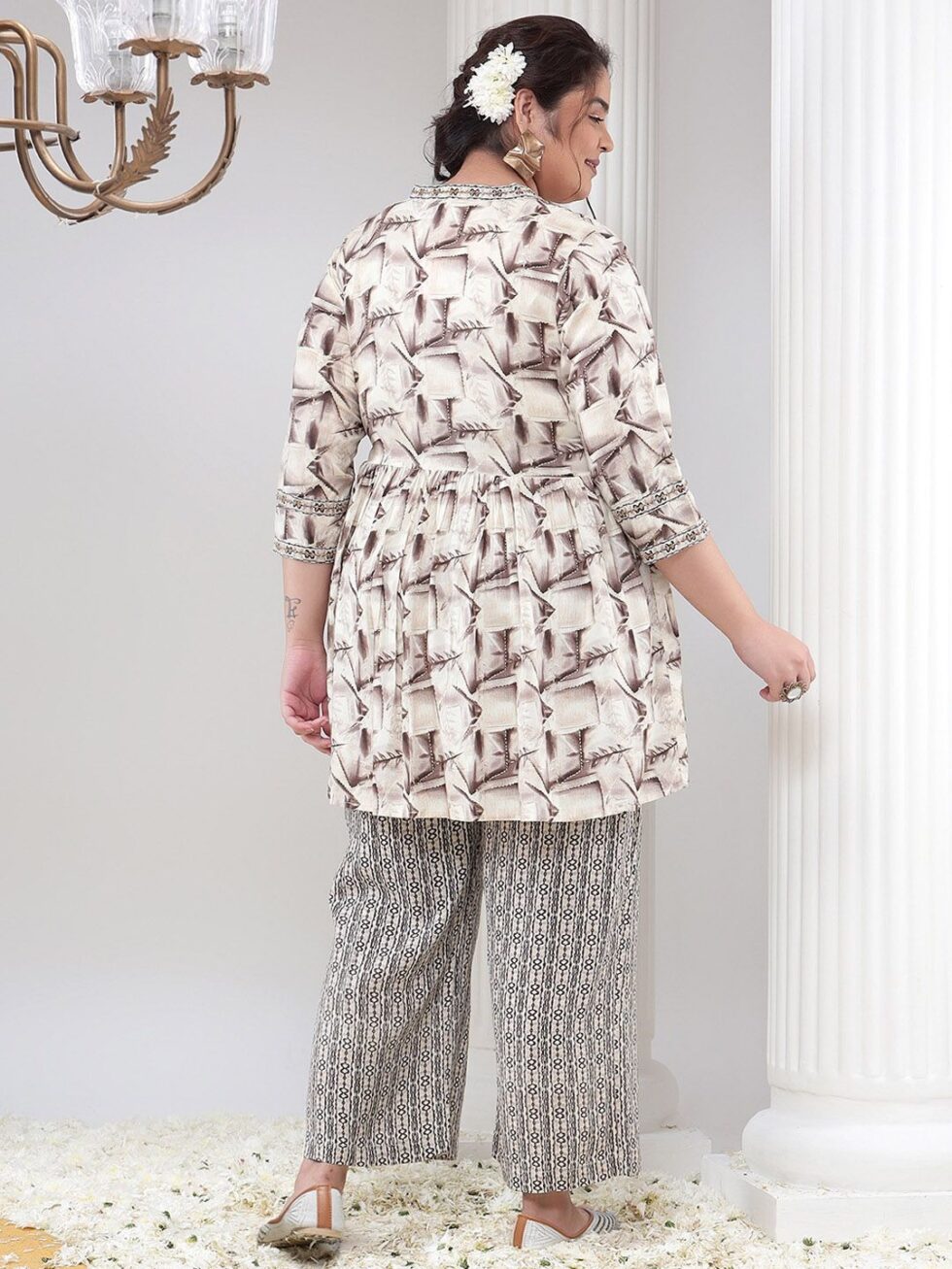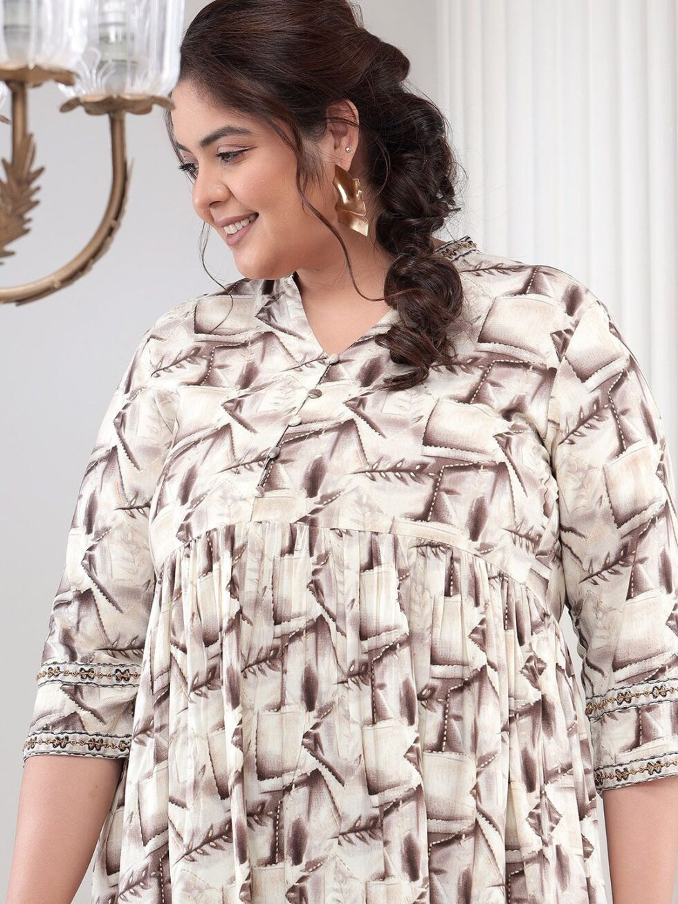 Off white & brown printed tunic, has mandarin collar, three quarter sleeves, button closure and flared waist hem