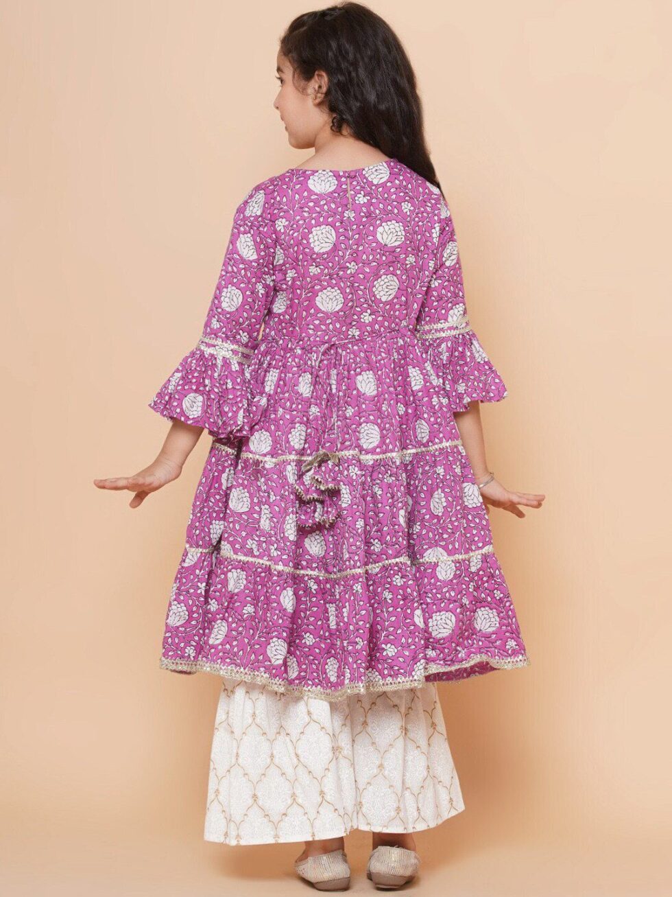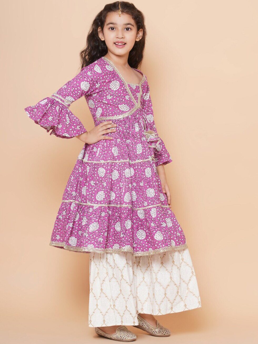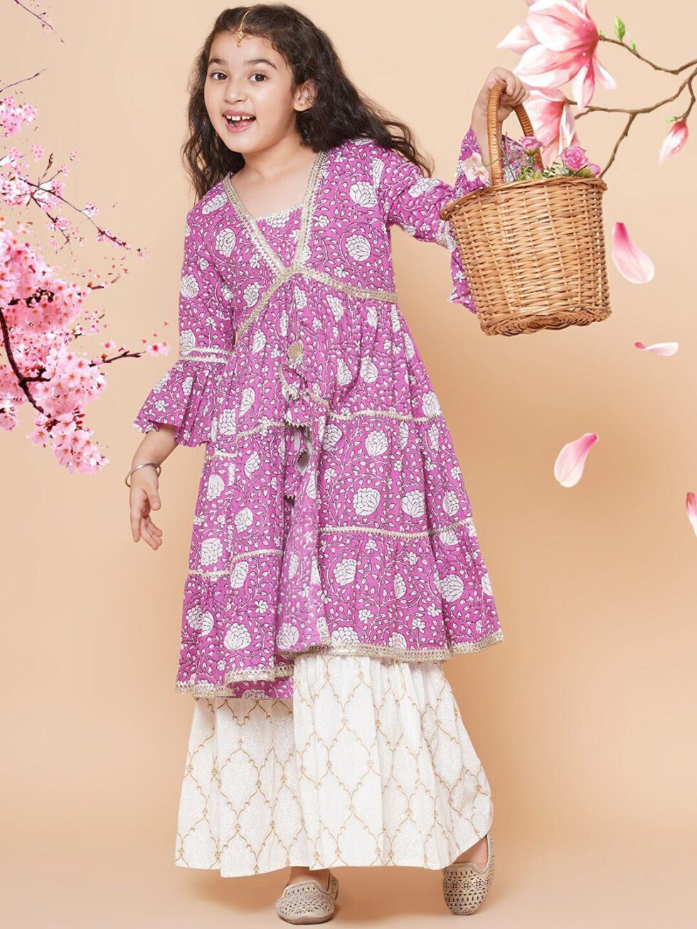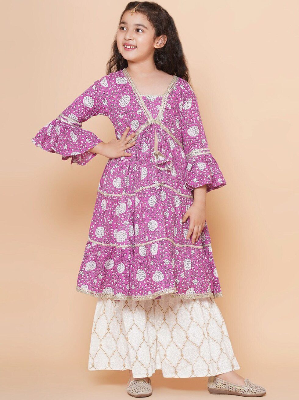Bitiya by Bhama Girls Floral Printed Bell Sleeves Gotta Patti Angrakha Kurta With Sharara