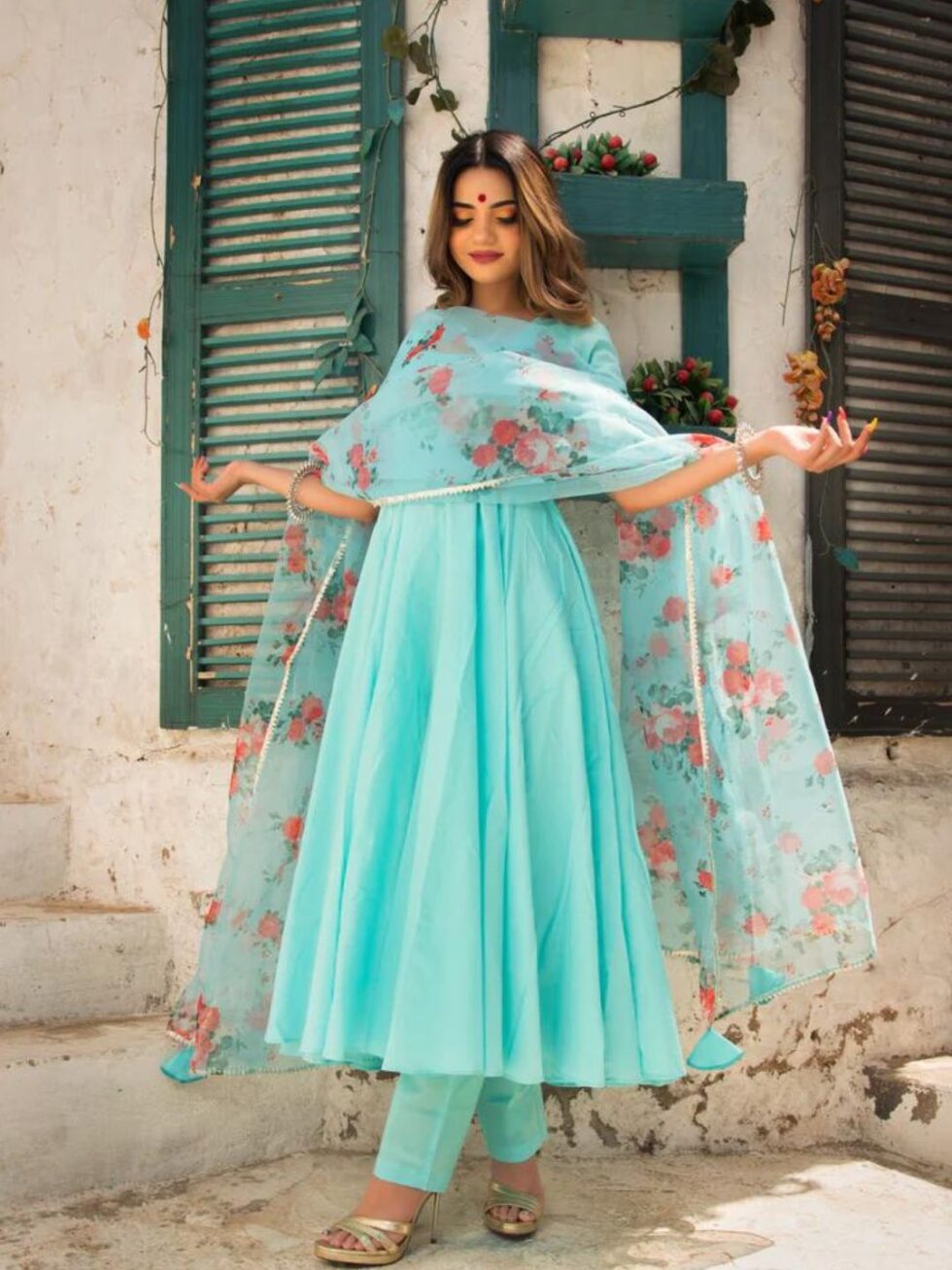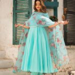 Beautiful cyan blue anarkali suit set with beautiful organza printed dupatta and hand made tassels make the piece look more gorgeous .
