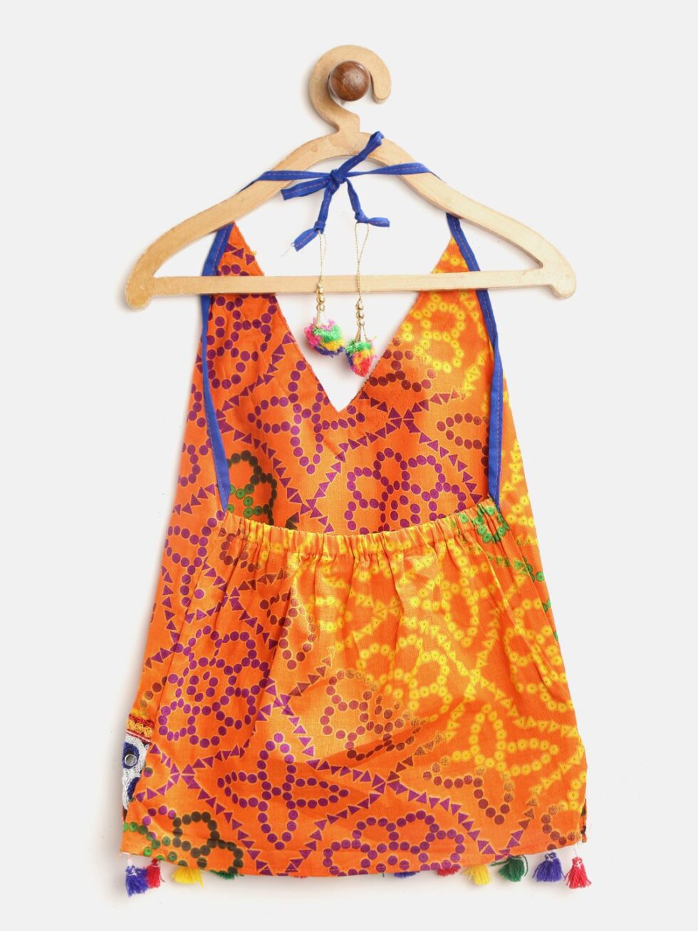 Orange and blue Bandhani print kurti with dhoti pants, has mirror work Orange, green and blue Bandhani print A-line above knee kurti with embroidered detail, has a halter neck, sleeveless, straight hem, side slits Blue embroidered dhoti pants, has slip-on closure
