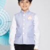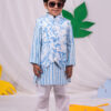 Aqua Blue floral printed cotton blend Nehru jacket, has a mandarin collar, a full button placket, sleeveless, three pockets Material & Care Silk blend Dry Clean preferably or cold light wash Sleeve Length – Sleeveless Top Shape – Straight Top Hemline – Straight Neck Mandarin Collar Jacket Pattern Printed Complete The Look Stay ahead of trend by getting your kids this amazing Nehru jacket from the brand Absolutely Desi. Tag it with a contrast traditional kurta and pants to complete the look for your little one