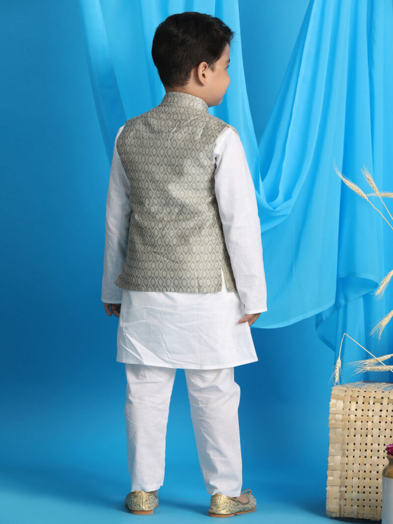 PRODUCT DETAILS White solid kurta with solid white pajama and beige woven design Nehru jacket. White solid straight knee length kurta, has a mandarin collar, long sleeves, straight hem White color solid pajama, has elasticated waistband, slip-on closure. Beige woven design, silk blend Nehru jacket, has a mandarin collar, a full button placket, sleeveless, a welt pocket. Comes with pocket square. Material & Care Top fabric: Silk blend Bottom fabric: Cotton blend Jacket Fabric : Cotton blend Dry-clean Sleeve Length – Long Sleeves Top Shape – Straight Top Hemline – Straight Top Length – Knee Length Neck – Mandarin Collar Print or Pattern Type – Solid Bottom Pattern – Solid Bottom Closure – Slip-On Waistband Elasticated Jacket Pattern Woven Design Complete The Look Sport this classic kurta set from Absolutely Desi this season. Dress this piece up with your favorite accessories and head out to any family event in style.