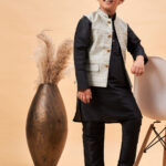 Product detail Beige color woven Nehru jacket, Regular style, has a mandarin collar, symmetric full button placket, sleeveless, one pocket with a pocket square, and symmetric hem. Black solid kurta, full sleeves, has a mandarin collar, knee-length, straight hemline, side-slits, and one pocket Black solid Pyjama, slip-on closure, elasticated waistband. Material care Jacket fabric: Silk Blend Top fabric: Silk Blend Bottom Fabric: Silk Blend Dry Clean Sleeve Length- Long Sleeves Top shape- Regular Top pattern- Solid Top hemline- Straight Top length- Knee length Neck- Mandarin Collar Print and Pattern- Solid Bottom Closure- Slip-on Closure Complete the Look Adorn your boy with this jacket by JBN Creation for a perfect classy & trendy look. Pair it with a juti or a mojari and look apart on special occasions.