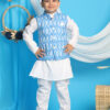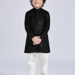 All over thread work embroidered and Sequined embellished above knee length regular kurta,has full sleeve, knee length and mandarin collar, button closure, straight hem and side slit, comes with comfortable pyjama set. Material & Care Top fabric: Rayon Bottom fabric:Viscose Blend Dry-clean Sleeve Length – Full Sleeve Top Shape – Straight Top Hemline – Straight Top Length Knee Length Neck -Mandarin/Chinese Neck Print or Pattern Type – Solid Complete The Look Dress your little gentleman in our beautiful Cotton self-design kurta . It has full sleeves and flat collar, side slits and pockets. Comes with comfortable pyjamas. Perfect for any festive occasion.