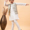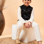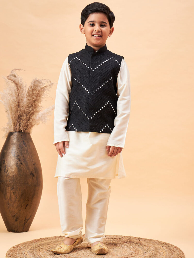 Black color mirror work Nehru jacket with cream color solid kurta and solid pyjama set. Kurta has full sleeves, straight hem, side open, mandarin collar and pockets. Pyjama is solid cream color and elasticated waistband. Material & Care Dry Clean preferably or cold light wash Top Fabric: Viscose Bottom Fabric: Viscose Jacket Fabric: Viscose Sleeve Length – Sleeveless Kurta Sleeves – Full Sleeves Neck – Mandarin Collar Pattern -Solid Bottom Pattern – Solid Jacket Patten- Mirror Detail Waistband – Elasticated Complete The Look Wear it to casual gatherings and parties or events. Impress everyone with your amazing fashion sense by donning this Nehru jacket. .