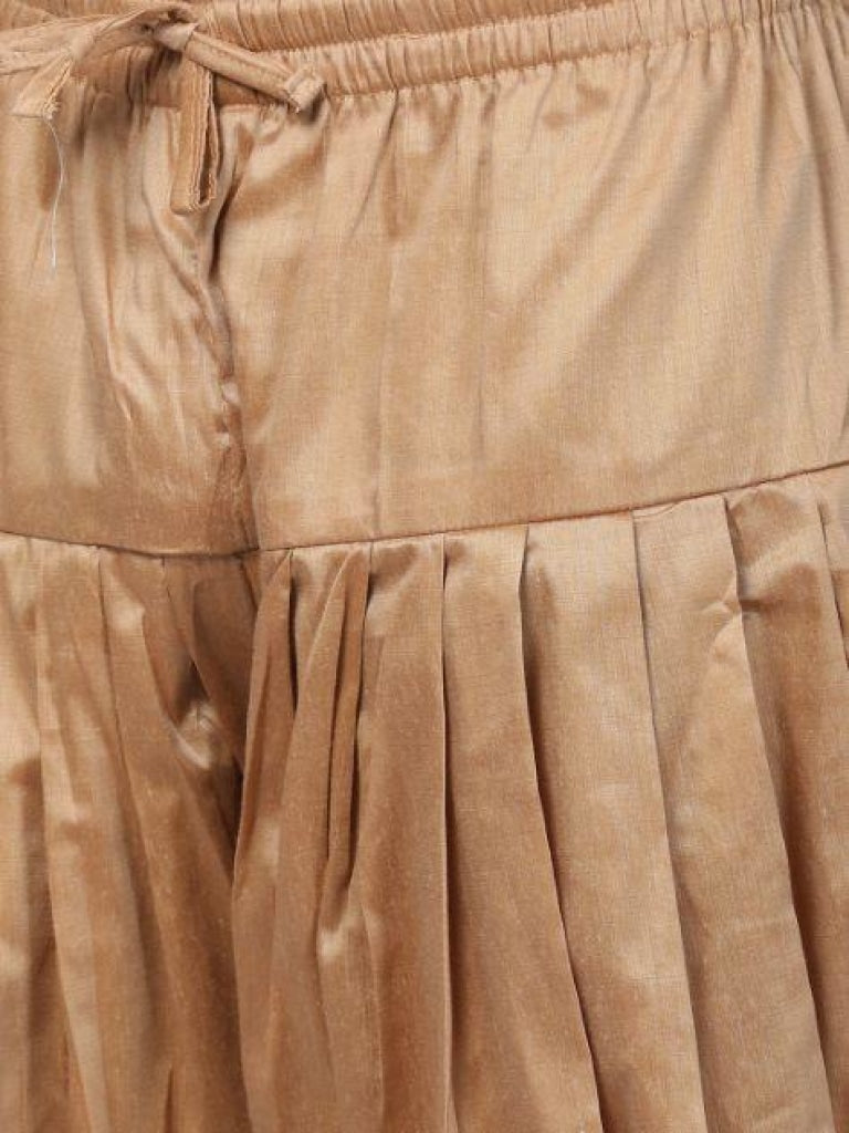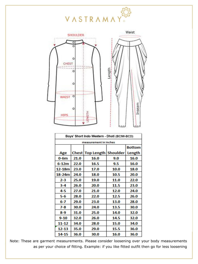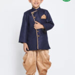 Navy solid kurta with dhoti pants Navy solid straight above knee kurta, has a mandarin collar, long sleeves, straight hem, side slits Golden Solid dhoti pants, has elasticated waistband, drawstring closure Material & Care Top fabric: Cotton blend Bottom fabric: Cotton blend Dry-Clean Sleeve Length – Long Sleeves Top Shape – Straight Top Hemline – Straight Top Length -Above Knee Length Neck – Mandarin collar Print or Pattern Type – Solid Bottom Pattern – Solid Bottom Closure – Slip-On Waistband Elasticated Complete The Look Let your child look charming even as he attends a wedding with his family members with this piece. It goes well with a pair of mojris.