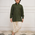 PRODUCT DETAILSThis stylish kurta Patiala set for boys is a perfect blend of tradition and elegance. The kurta features intricate gold foil work arranged in vertical patterns, adding a regal and festive touch to the fabric. Designed with a classic collared neckline and with gold-buttoned placket for a timeless ethnic charm, Long sleeves with cuffs for a tailored, sophisticated appeal . Paired with a matching Patiala, this outfit is ideal for weddings, festivals, and cultural events, ensuring your little one stands out in any celebration. Comfortable and breathable, this set combines style with ease of movement.