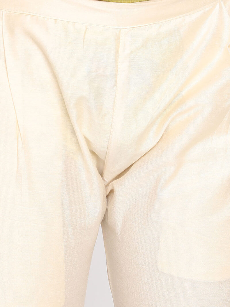 Cream-coloured slim-fit sherwani set Cream-coloured slim-fit sherwani set with mirror work details, has a mandarin collar, a full concealed button placket, straight hem, multiple slits A pair of cream-coloured solid slim-fit mid-rise pyjamas, has a waistband with a zip closure Material & Care Silk Blend Dry Clean preferably or cold light wash Sleeve Length – Long Sleeves Top Length – Knee Length Neck – Mandarin collar Fabric -Silk Blend Complete The Look Add this stylish sherwani set from Absolutely Desi to your kid’s wardrobe. It is ideal to be paired with shirt for formal look or can also be paired with kurta for a fusion look.