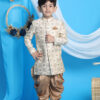 Gold Color woven design above knee length sherwani, has a mandarin collar, full button placket, long sleeves, a straight hem, side slits, a welt pocket and pocket square. Comes with Maroon color solid dhoti pant, has elasticated waistband. Material & Care Top Fabric: Jute Cotton Bottom Fabric: Viscose Dry Clean preferably or cold light wash Sleeve Length- Long Sleeves Top pattern- Woven Top hemline- Straight Top length- knee length Neck- Mandarin Collar Bottom Waist- Elasticated Bottom Closure- Slip-on Closure Complete the Look Celebrate your little ones personal style and roots with this elegant Sherwani set from Absolutely Desi.