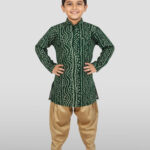 PRODUCT DETAIL Green color cotton blend bandhni print kurta and rose gold solid patiyala set. Green color bandhni print straight knee-length kurta, has a mandarin collar, long sleeves, straight hem, side slits, foil detailing on print. Rose gold color Solid Patiyala, has an elasticated waistband, slip-on closure Material & Care Top fabric: Cotton blend Bottom fabric: Cotton blend Dry Clean Sleeve length -Long Sleeves Top Shape-Regular Top Pattern- Printed Top Hemline- Straight Top Length- Knee Length Neck- Mandarin Collar Print or Pattern Solid Bottom Closure- Drawstring Closure Complete the Look Celebrate your little one’s personal style and roots with this elegant blue kurta set from Absolutely Desi.