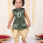 Green color foil brocade sleeveless kurta has mandarin collar, side slit, two pockets, front open, knee length kurta comes with golden solid dhoti south collection set. Material & Care Top fabric: Silk Blend Bottom fabric: Silk Blend Dry-clean Sleeve Length Sleeveless Top Shape – Straight Top Hemline – Straight Top Length Knee Length Neck – Mandarin collar Print or Pattern Type – Brocade Bottom Type – Pyjama Bottom Pattern – Solid Waistband Elasticated