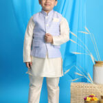 PRODUCT DETAILS Cream solid kurta with solid cream pajama and lavender woven design Nehru jacket. Cream solid straight knee length kurta, has a mandarin collar, long sleeves, straight hem Cream color solid pajama, has elasticated waistband, slip-on closure. Lavender woven design, silk blend Nehru jacket, has a mandarin collar, a full button placket, sleeveless, a welt pocket. Comes with pocket square. Material & Care Top fabric: Silk blend Bottom fabric: Cotton blend Jacket Fabric : Cotton blend Dry-clean Sleeve Length – Long Sleeves Top Shape – Straight Top Hemline – Straight Top Length – Knee Length Neck – Mandarin Collar Print or Pattern Type – Solid Bottom Pattern – Solid Bottom Closure – Slip-On Waistband Elasticated Jacket Pattern Woven Design Complete The Look Sport this classic kurta set from Absolutely Desi this season. Dress this piece up with your favorite accessories and head out to any family event in style.