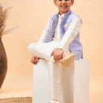 PRODUCT DETAILS Cream solid kurta with solid white pajama and lavender color woven design Nehru jacket. Cream solid straight knee length kurta, has a mandarin collar, long sleeves, straight hem Cream color solid pajama, has elasticated waistband, slip-on closure. Lavender woven design, silk blend Nehru jacket, has a mandarin collar, a full button placket, sleeveless, a welt pocket. Comes with pocket square. Material & Care Top fabric: Silk blend Bottom fabric: Silk blend Jacket Fabric : Silk blend Dry-clean Sleeve Length – Long Sleeves Top Shape – Straight Top Hemline – Straight Top Length – Knee Length Neck – Mandarin Collar Print or Pattern Type – Solid Bottom Pattern – Solid Bottom Closure – Slip-On Waistband Elasticated Jacket Pattern Woven Design Complete The Look Sport this classic kurta set from Absolutely Desi this season. Dress this piece up with your favorite accessories and head out to any family event in style.