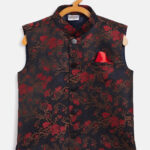 Maroon and black woven design regular-fit Nehru jacket, has a mandarin collar, a full button placket, sleeveless, and one pocket Comes with a pocket square Material & Care Silk blend Dry clean preferably or cold light wash Sleeve Length – Sleeveless Top Shape – Straight Top Hemline – Straight Neck Mandarin Collar Jacket Pattern Woven Complete The Look The ways that your boy can wear this luxurious waist coat is endless, you can mix and match this waistcoat with other things from his wardrobe.
