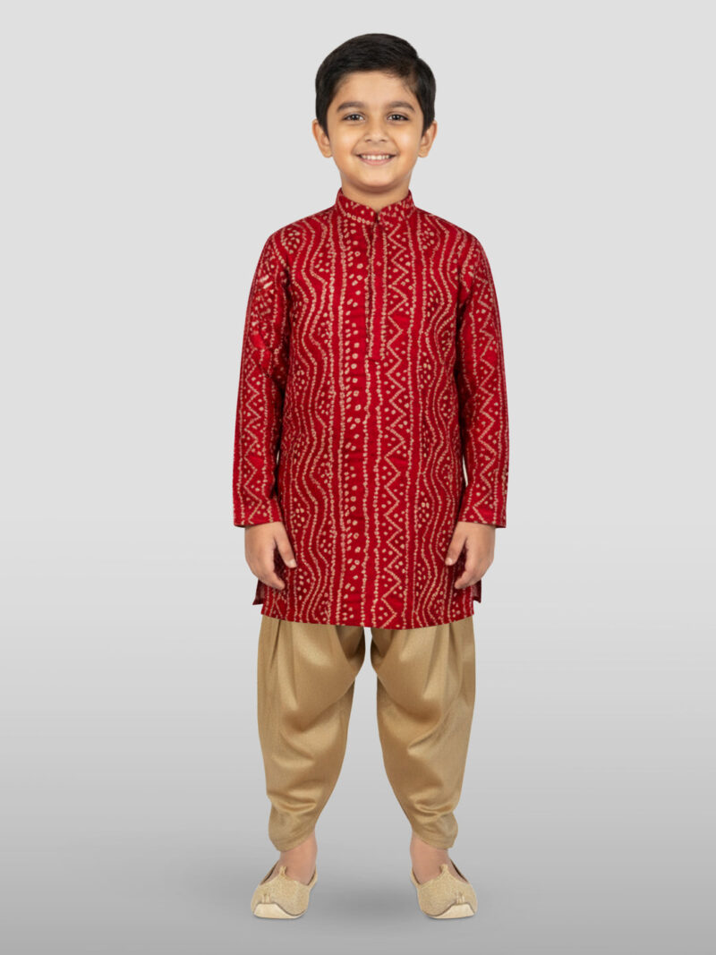 PRODUCT DETAIL Marron color cotton blend bandhni print kurta and rose gold solid patiyala set. Maroon color bandhni print straight knee-length kurta, has a mandarin collar, long sleeves, straight hem, side slits, foil detailing on print. Rose gold color Solid Patiyala, has an elasticated waistband, slip-on closure Material & Care Top fabric: Cotton blend Bottom fabric: Cotton blend Dry Clean Sleeve length -Long Sleeves Top Shape-Regular Top Pattern- Printed Top Hemline- Straight Top Length- Knee Length Neck- Mandarin Collar Print or Pattern Solid Bottom Closure- Drawstring Closure Complete the Look Celebrate your little one’s personal style and roots with this elegant blue kurta set from Absolutely Desi.