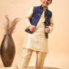 Product detail Navy Blue color embroidered Nehru jacket, Regular style, has a mandarin collar, symmetric full button placket, sleeveless, one pocket with a pocket square, and symmetric hem. Cream solid kurta, full sleeves, has a mandarin collar, knee-length, straight hemline, side-slits, and one pocket Cream solid Pyjama, slip-on closure, elasticated waistband. Material care Jacket fabric: Silk Blend Top fabric: Viscose Bottom Fabric: Viscose Dry Clean Sleeve Length- Long Sleeves Top shape- Regular Top pattern- Solid Top hemline- Straight Top length- Knee length Neck- Mandarin Collar Print and Pattern- Solid Bottom Closure- Slip-on Closure Complete the Look Adorn your boy with this jacket by JBN Creation for a perfect classy & trendy look. Pair it with a juti or a mojari and look apart on special occasions.