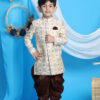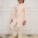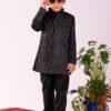 This is a stylish and elegant Indo-Western kurta and pyjama set for boys. The set features a black kurta with a mandarin collar and subtle embellishments that add a touch of sophistication. It is paired with matching black trousers, creating a sleek and formal look. Perfect for festive occasions, weddings, or cultural celebrations, this outfit combines traditional charm with modern design. Material & Care Top fabric: Velvet Bottom fabric: Suiting Dry-clean Sleeve Length – Full Sleeve Top Shape – Regular Top Hemline – Straight Top Length – Above Knee Neck – Mandarin Collar Print or Pattern Type – Embellished