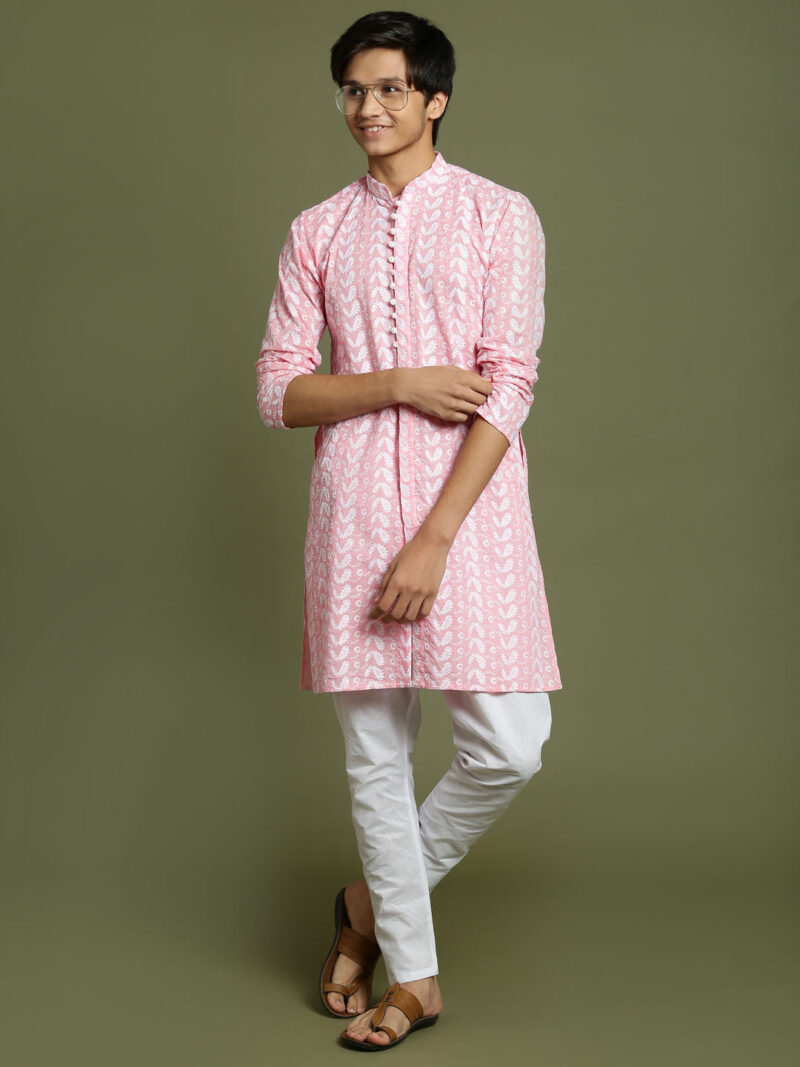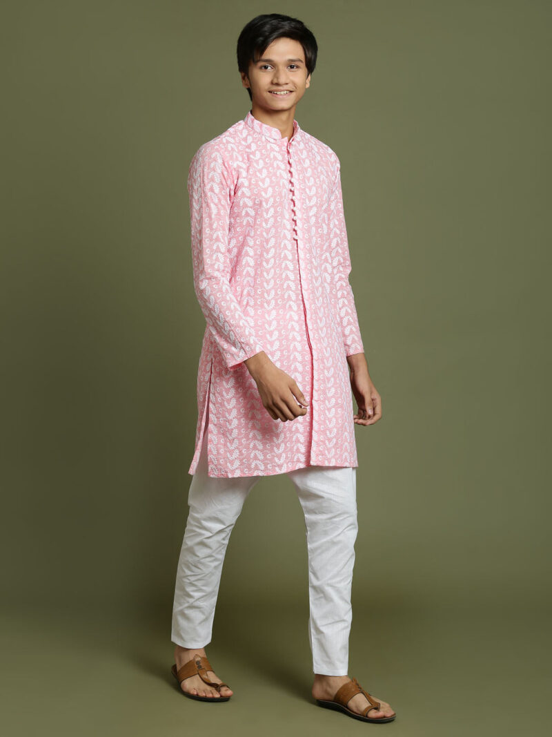 PRODUCT DETAIL Cotton kurta pyjama set in self design all over lukhnowi chikankari embroidery, has full sleeves, mandarin collar, button closure and comes with cotton relaxed pyjama. Material & Care Top fabric: Pure Cotton Bottom fabric: Pure Cotton Dry-clean Sleeve Length – Long Sleeves Top Shape – Straight Top Hemline – Straight Top Length – Knee Length Neck – Mandarin Collar Print or Pattern Type – Embroidered Bottom Pattern – Solid Bottom Closure – Slip-On Waistband Elasticated Complete The Look Celebrate your little one’s personal style and roots with this elegant kurta set from Absolutely Desi.