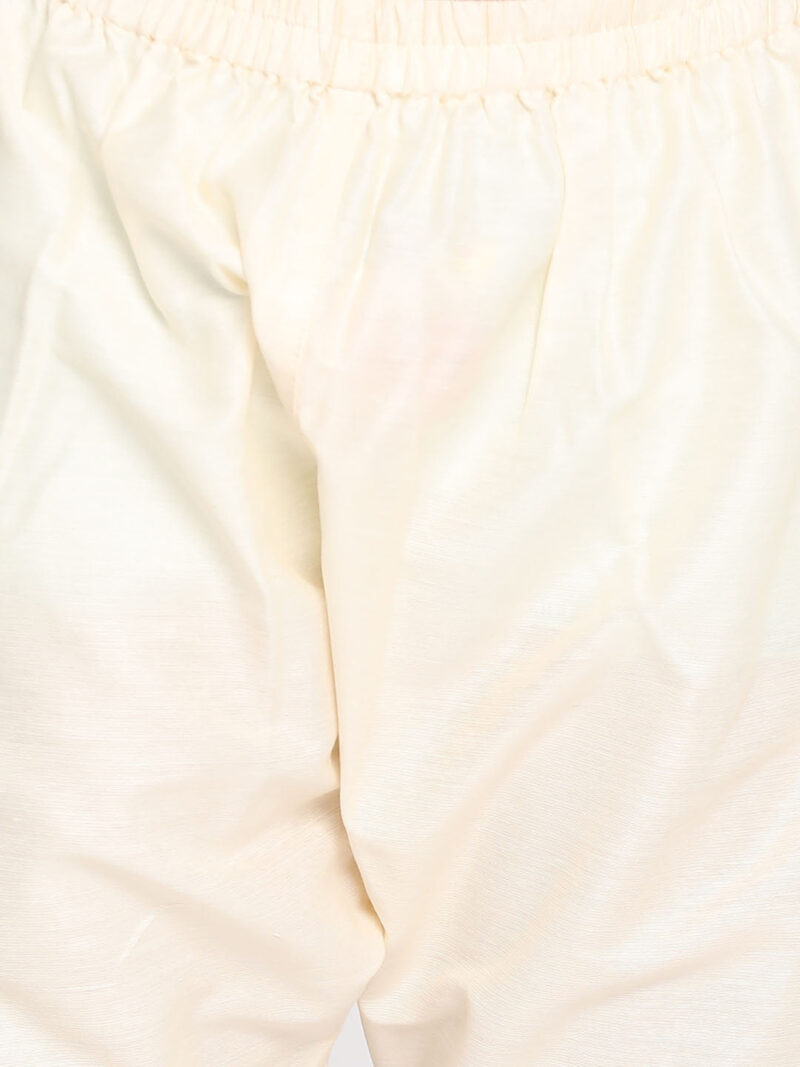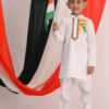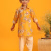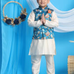 Turquoise blue, orange and green printed nehru jacket, has a mandarin collar, sleeveless, a full button placket, one pocket Comes with a pocket square And Cream Color viscose solid kurta has a mandarin color, full sleeves, knee length, with two pockets with solid cream viscose pyjama Material & Care Jacket Fabric: Silk Blend Top Fabric: Viscose Dry-clean preferably or cold light wash Add-Ons – Pocket Square Better Cotton Initiative – Regular Fabric -Silk Blend Number of Pockets – 1 Pattern -Printed Sustainable – Regular Wash Care – Dry Clean Weave Type – Satin waist band- elasticated Top Pattern- Solid Complete The Look Absolutely Desi trend brings to you a stylish yet comfortable nehru jacket which has been designed keeping the latest trends in mind. It is a great addition to your kids wardrobe and will win you compliments from one and all.