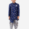 PRODUCT DETAIL Yellow solid Sherwani with Dhoti pants, Angrakha style, Straight Regular-length Sherwani, has a Mandarin collar, long sleeves, Straight hem; side slits, and one pocket with a pocket square. Gold solid Dhoti pants, slip-on closure, elasticated waistband. Material & Care Top fabric: Jute Silk Bottom fabric: Jute Silk Dry Clean Sleeve length -Long Sleeves Top Shape- Angrakha style Top Pattern- Solid Top Hemline- Straight Top Length- Regular Length Neck-Mandarin Collar Print or Pattern Solid Bottom Closure- Slip-on Closure Complete the Look Celebrate your little one’s personal style and roots with this elegant blue kurta set from Absolutely Desi.