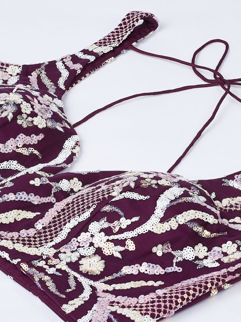 ? Blouse:- Burgundy Net all over material With Heavy sequinse and thread Embroidery work. Has a shantoon inner attached.