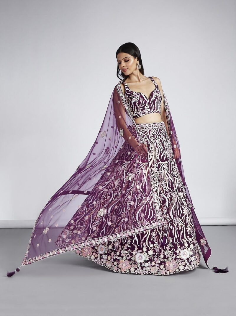 ? Lehenga:- Made of premium quality Burgundy Colour Net fabric Full Flaire Semi-Stitched Lehenga With heavy Sequins work and Coding thread Embroidery work. Has a thread cut work border on the hemline.
