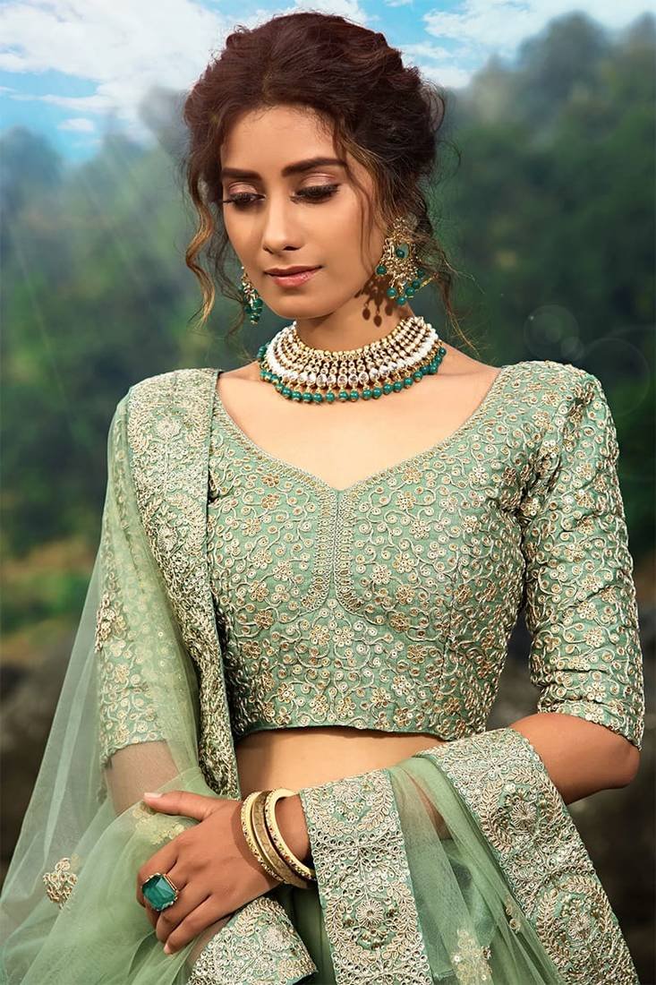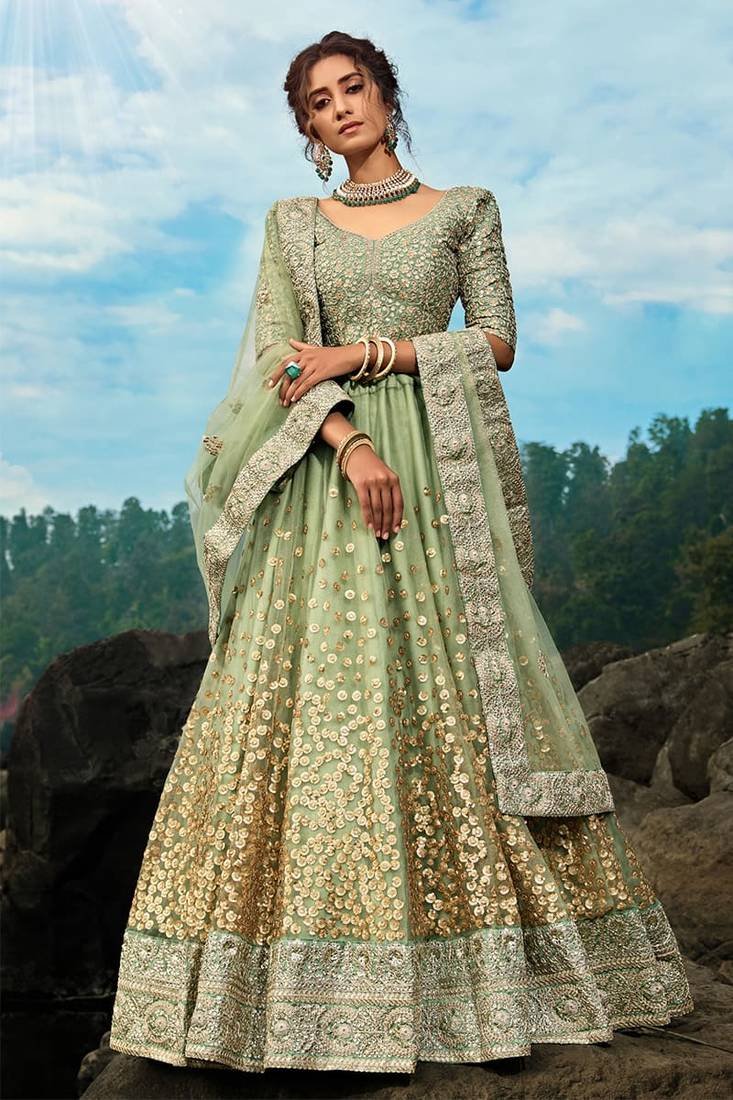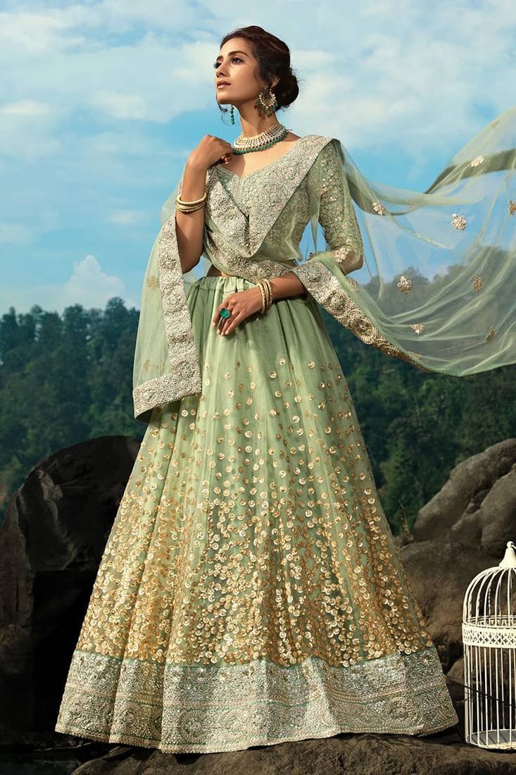 CHARMING SEA GREEN NET BASE SEQUIN ZARI RESHAM WORK LEHENGA CHOLI