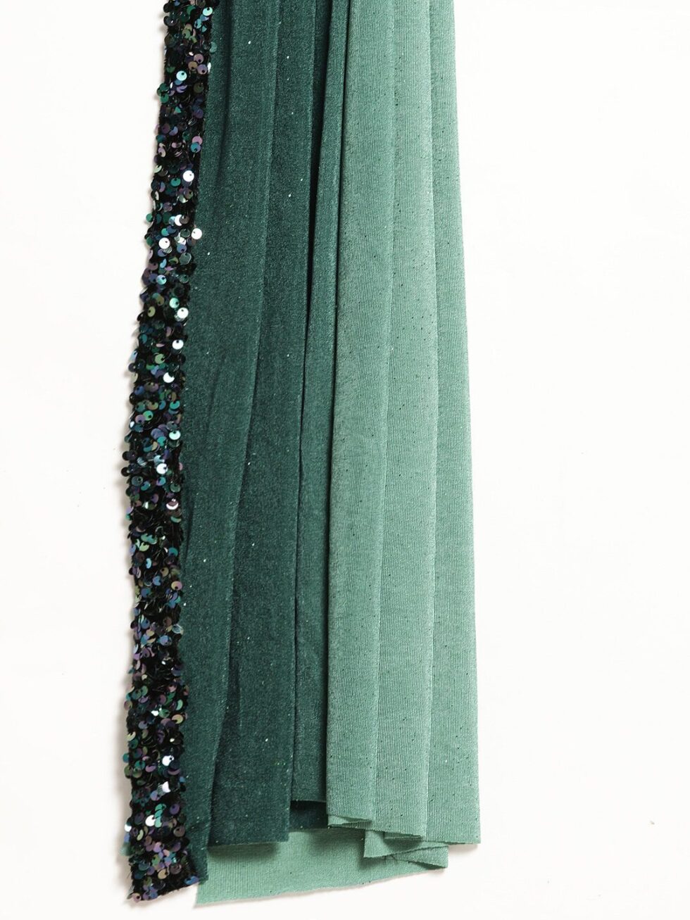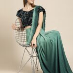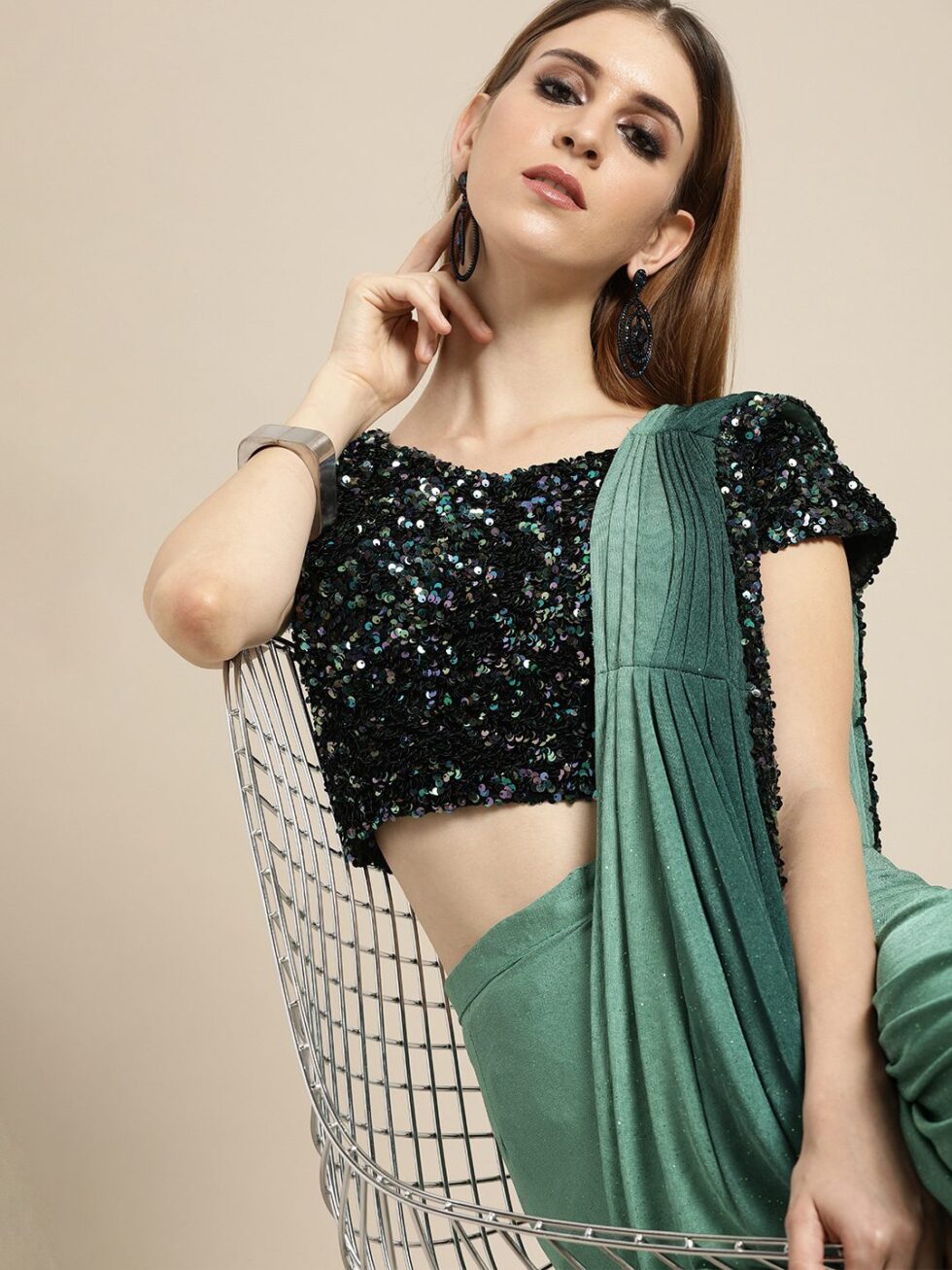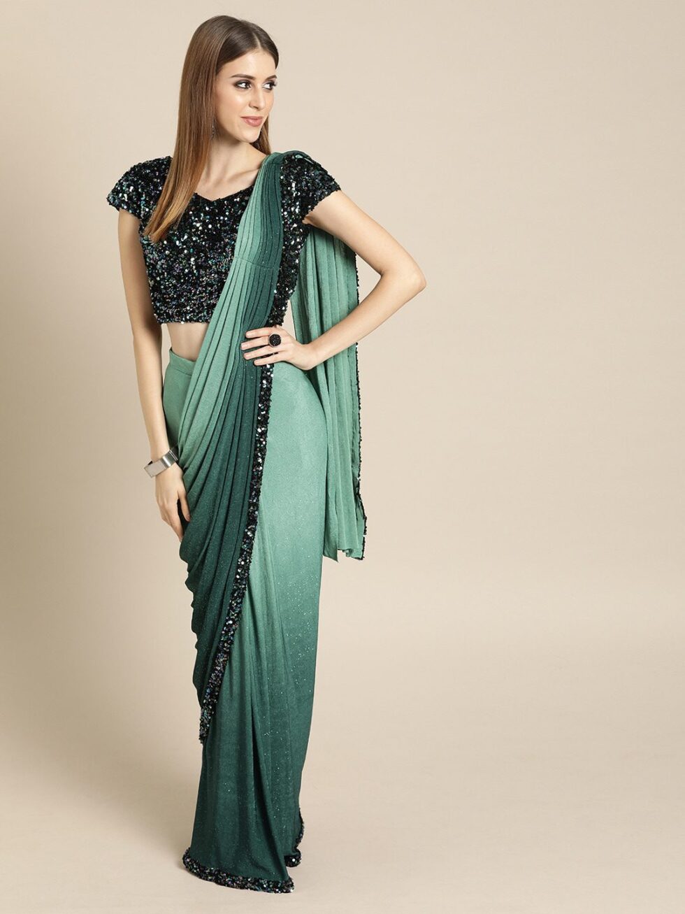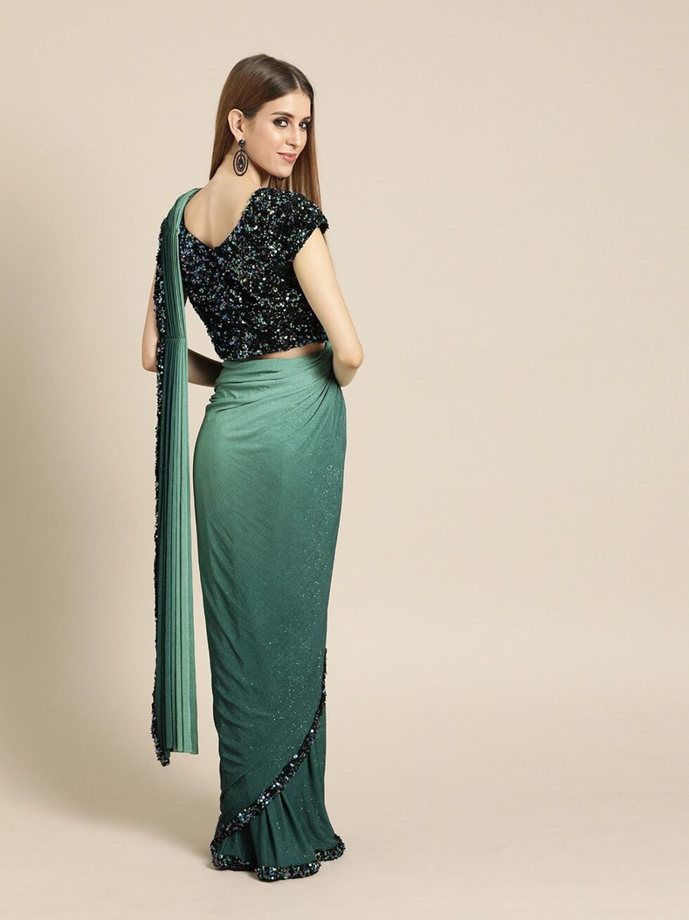 Design Details: Green ombre-dyed ready to wear saree, has a waistband with hook-and-bar closure Comes with a black sequinned stitched blouse, has a V-neck, short sleeves, concealed zip closure on the side, and padded cups Disclaimer: The model is wearing a stitched blouse that comes with the saree
