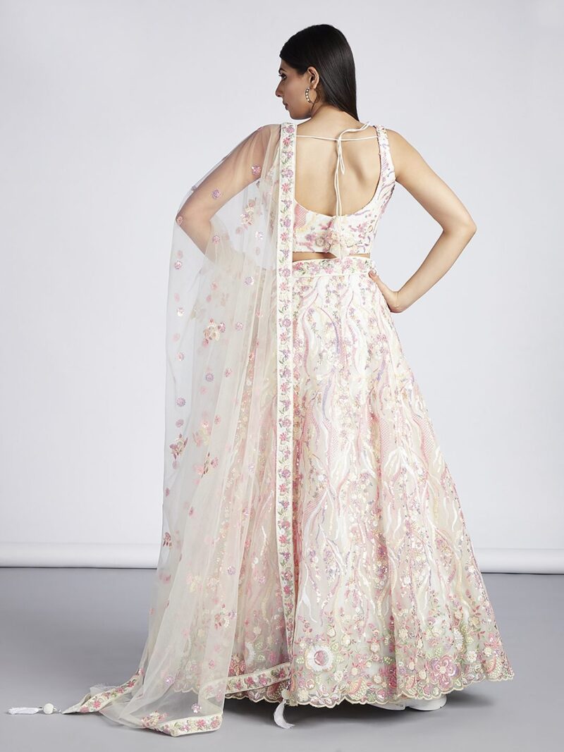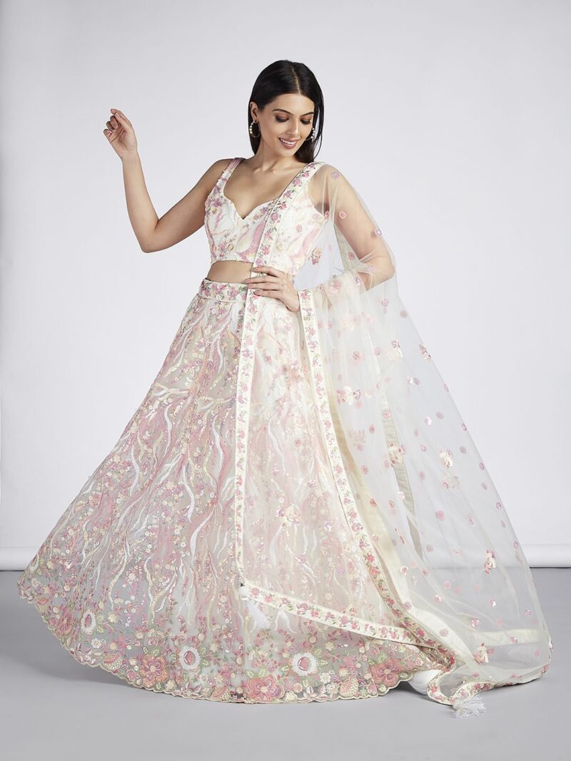 ? Lehenga:- Made of premium quality Cream Colour Net fabric Full Flaire Semi-Stitched Lehenga With heavy Sequins work and Coding thread Embroidery work. Has a thread cut work border on the hemline.