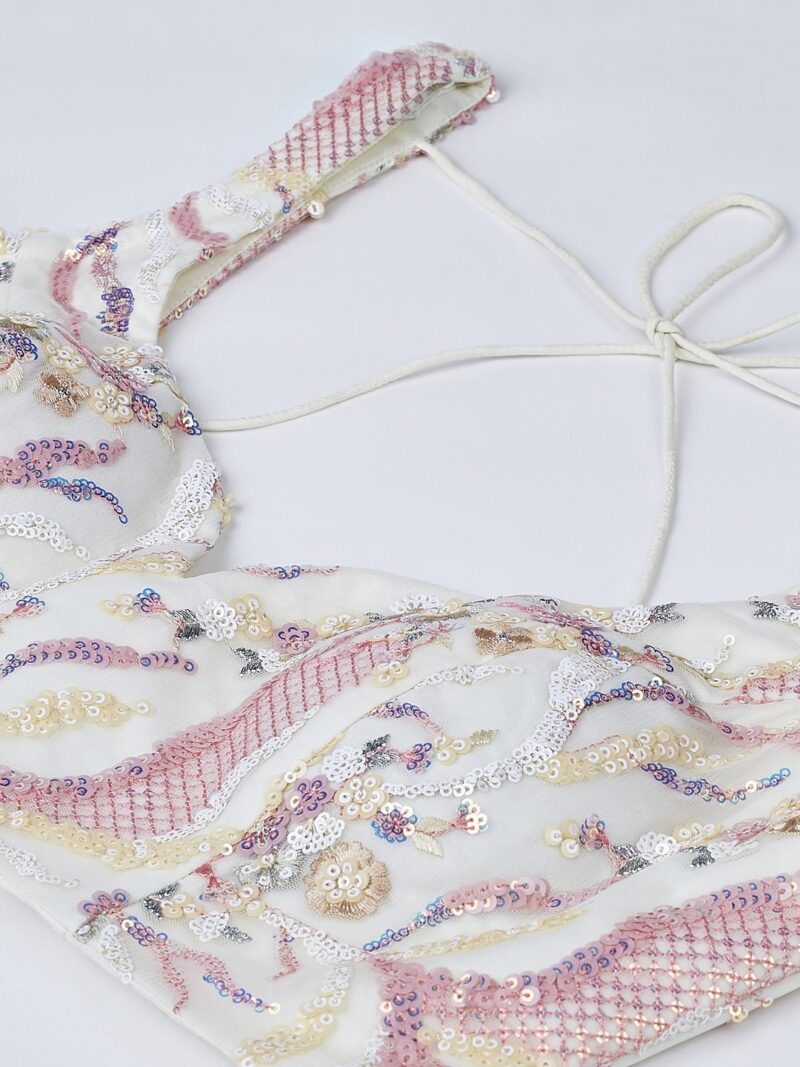 ? Blouse:- Cream Net all over material With Heavy sequinse and thread Embroidery work. Has a shantoon inner attached.