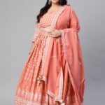 Celebrate your curves and embrace your unique beauty with the Divena Plus Size Lehenga Peach-Coloured Printed Ready to Wear & Blouse with Dupatta by Absolutely Desi. This exquisite ensemble is designed to accentuate and flatter every curve, ensuring you feel confident and stunning for any special occasion. This plus-size lehenga features a comfortable and flattering fit that celebrates your individuality. The rich colors, intricate embellishments, and luxurious fabrics create a mesmerizing look that exudes elegance and grace. Whether you’re attending a wedding, a festive celebration, or a cultural event, this lehenga will make a statement with its impeccable craftsmanship and impeccable style. Embrace your curves and shine with the Plus Size Lehenga by Absolutely Desi, a true embodiment of beauty and inclusivity.