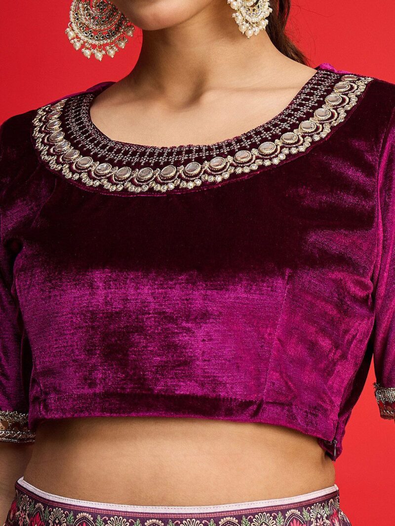 Purple embellished ready to wear blouse, has a round neck, short sleeves
