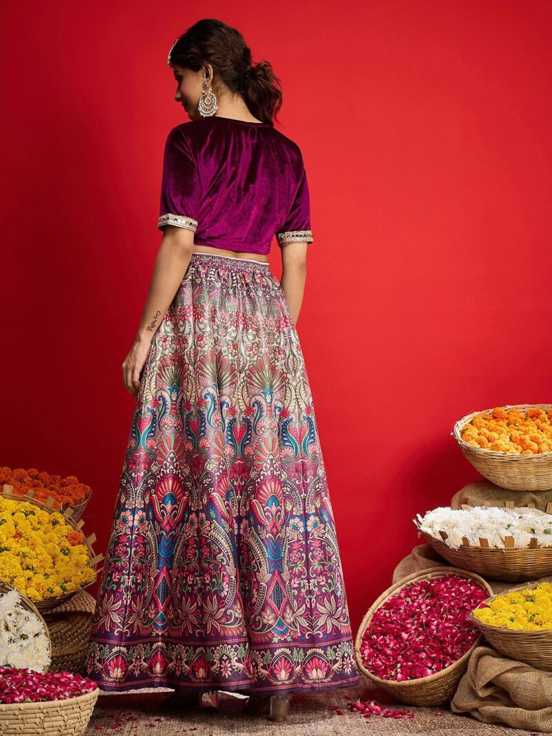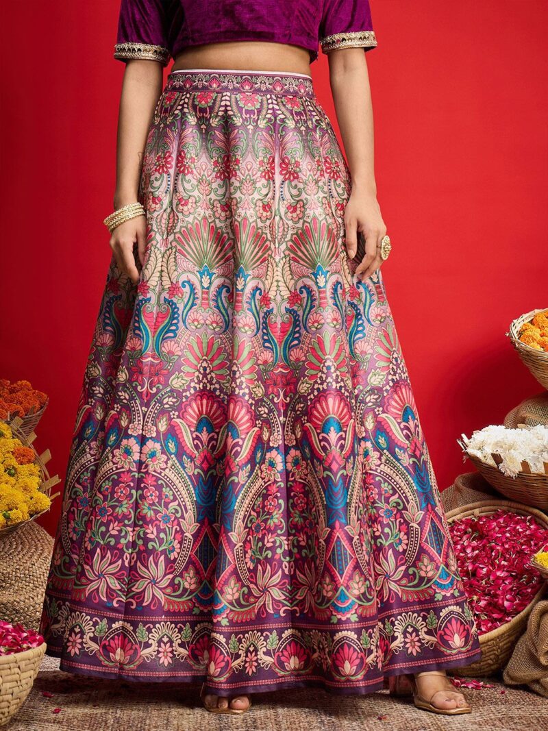 Purple, green and blue printed ready to wear lehenga, has slip-on closure, flared hem