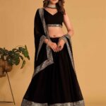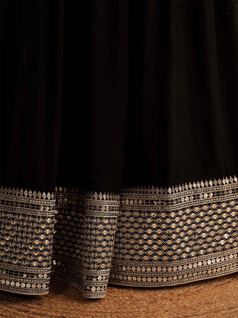 Black and gold-toned embroidered lehenga choli with dupatta, sequinned