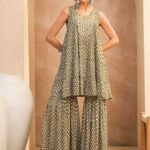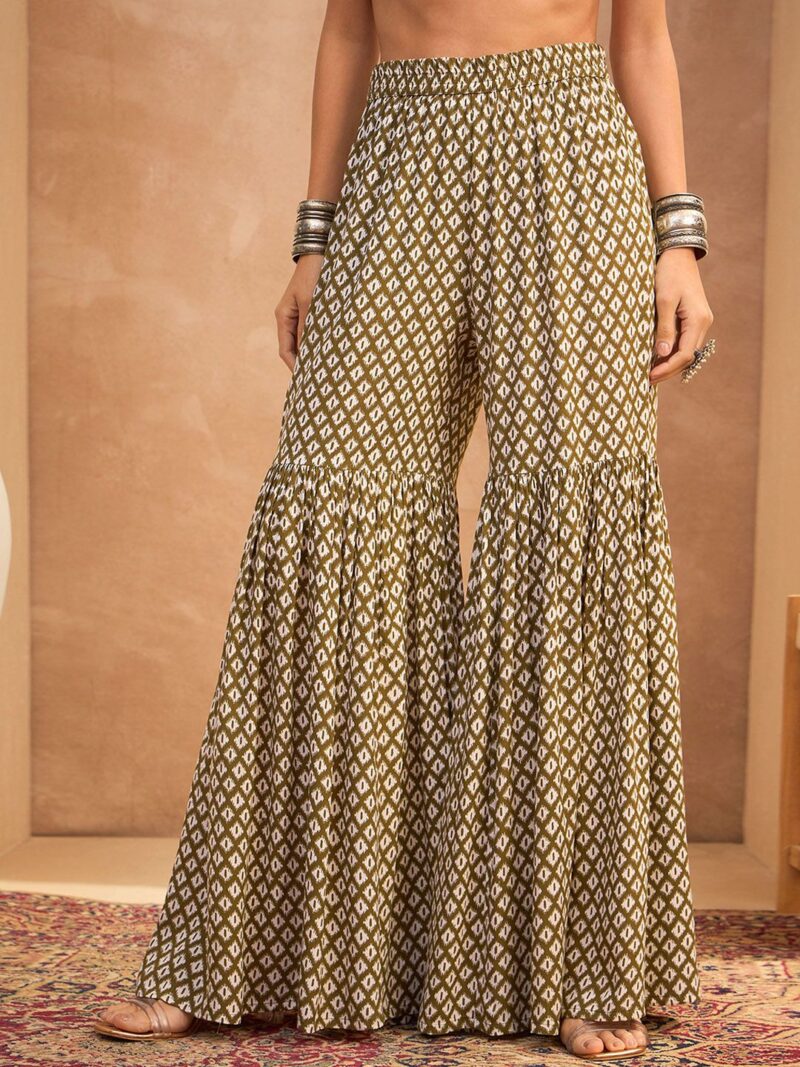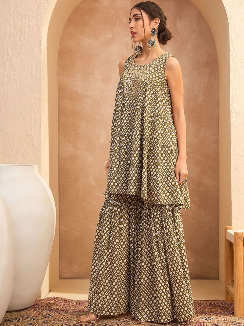 Olive green & white,gold toned embroidered Kurti with Sharara