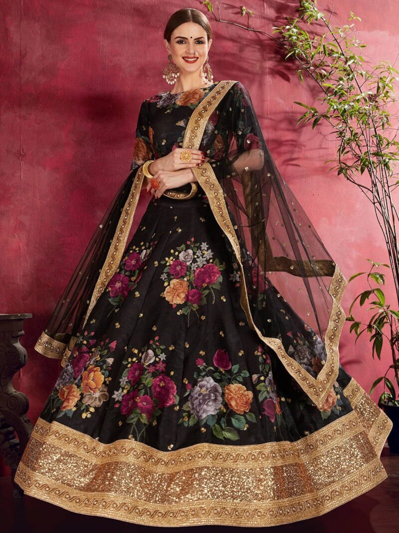 Black and red printed unstitched blouse, has a round neck, short sleeves, black and red printed semi-stitched lehenga, straight hem
