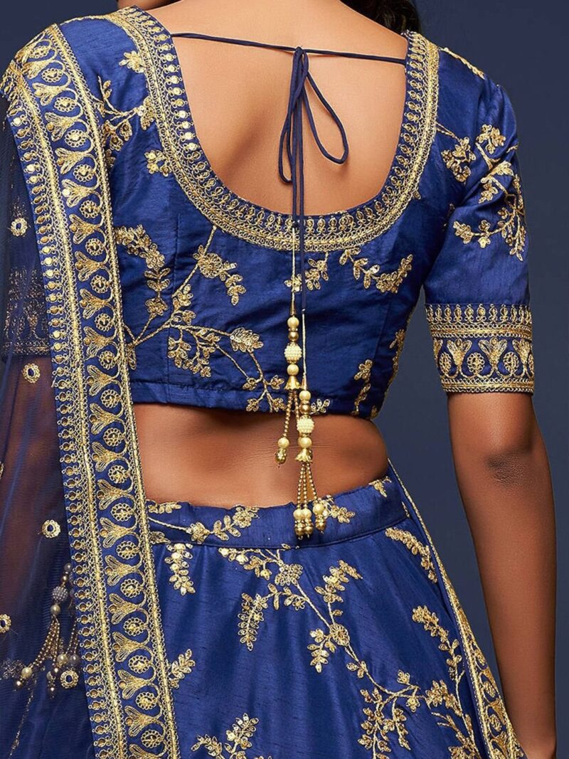 Blue embroidered semi-stitched lehenga, has drawstring closure, flared hem