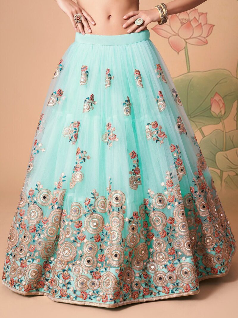 Embroidered lehenga choli with dupatta, has leheriya technique and mirror work