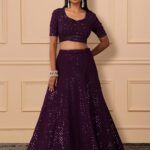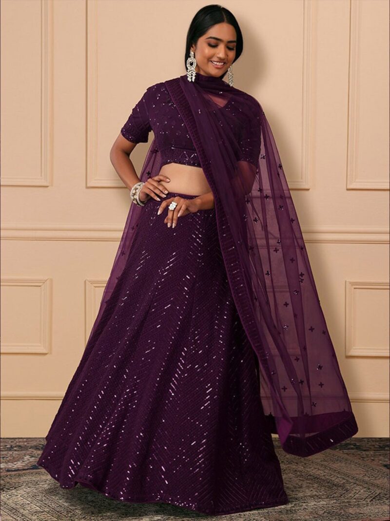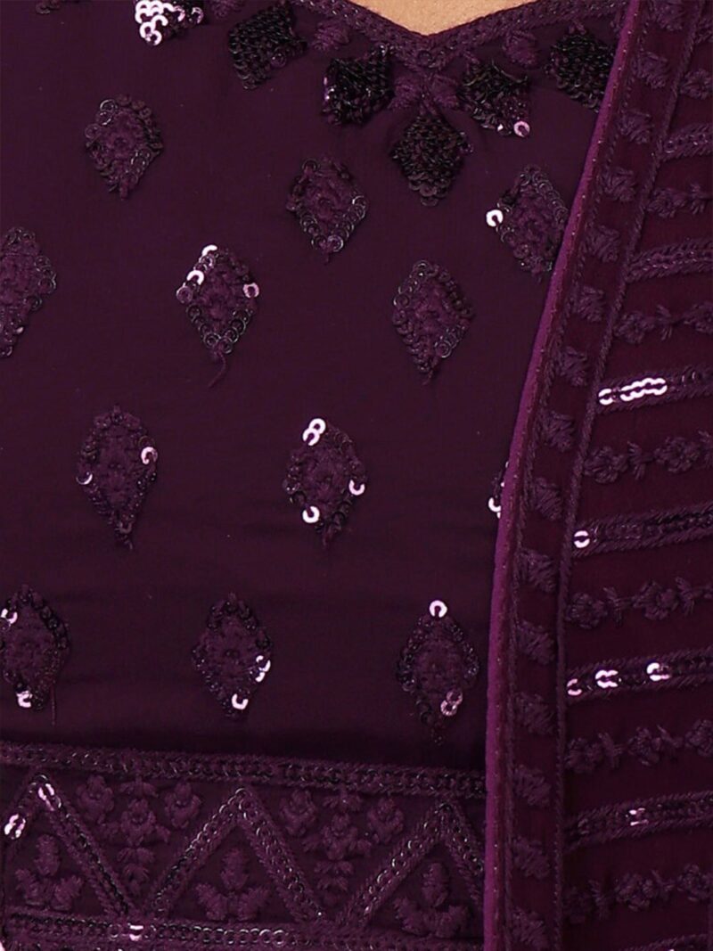 Purple embroidered unstitched blouse, has a round neck, short sleeves, Purple embroidered semi-stitched lehenga, flared hem