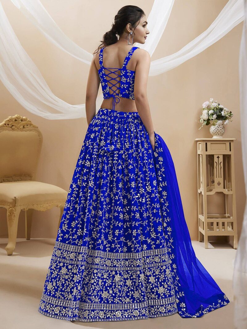 Blue and gold-toned embroidered lehenga choli with dupatta, sequinned