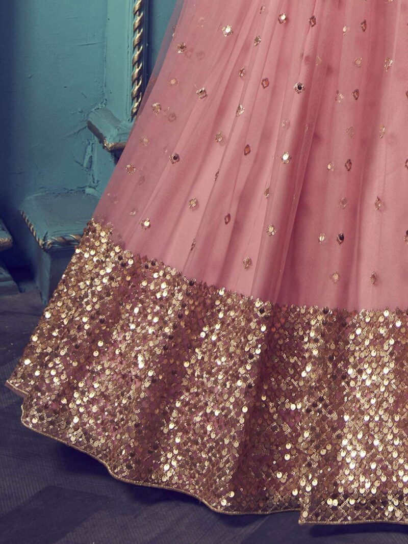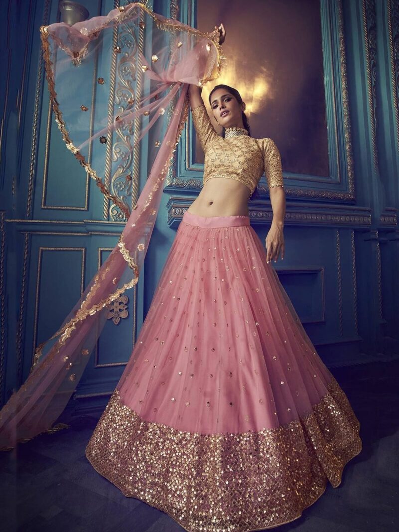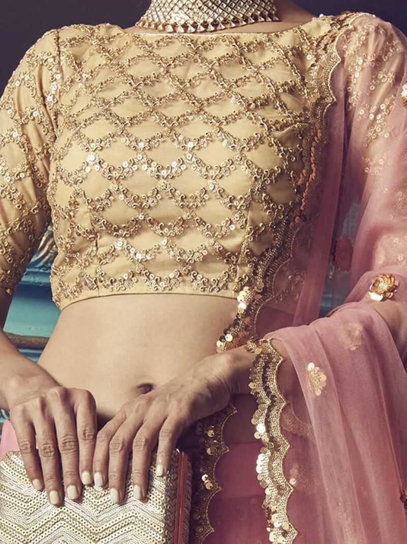 Pink and gold-toned embroidered lehenga choli with dupatta, sequinned