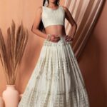 White embroidered unstitched blouse, has a round neck, sleeveless, white embroidered semi-stitched lehenga, flared hem