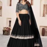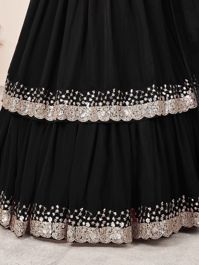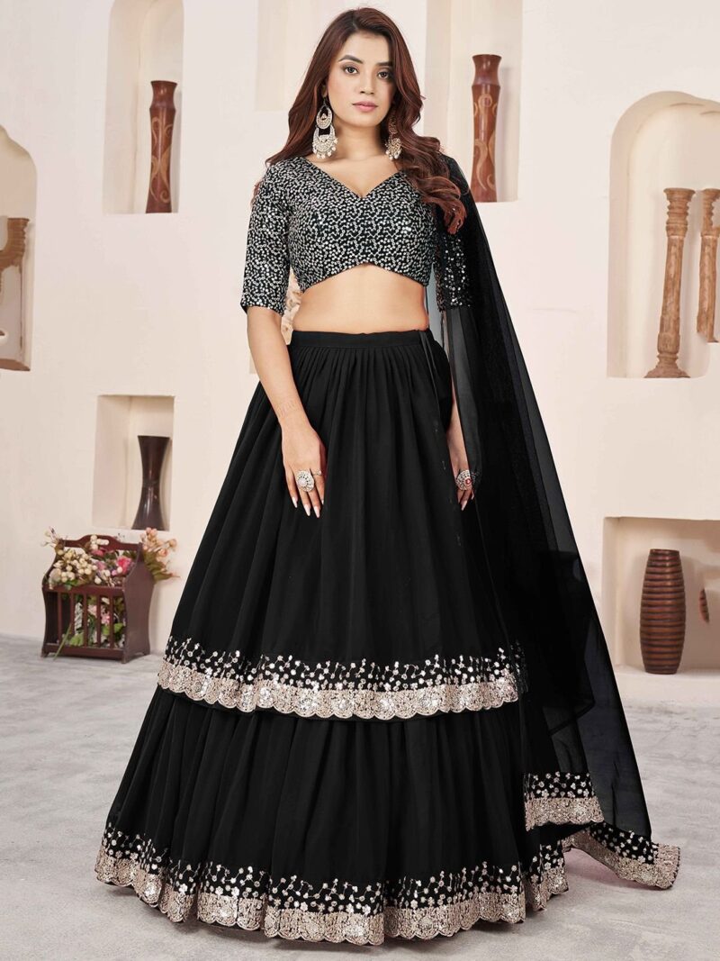 Black and silver-toned embroidered lehenga choli with dupatta, sequinned