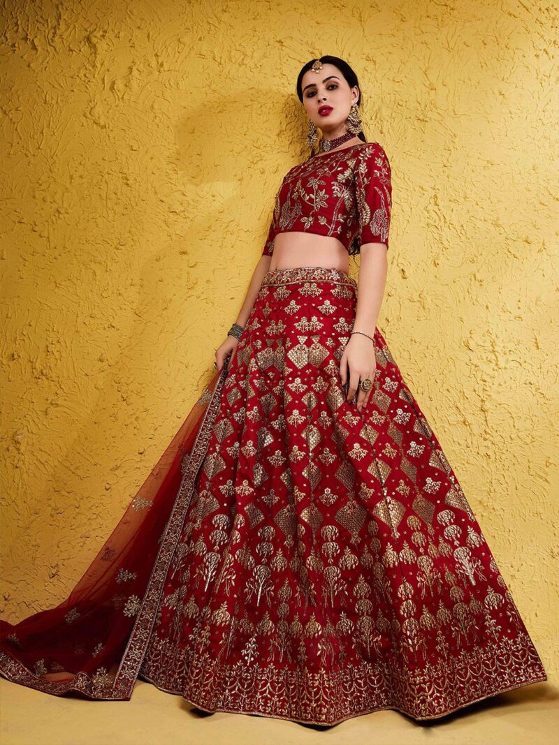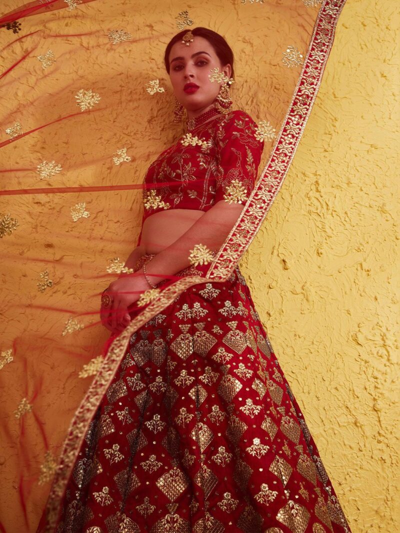 Red and gold-toned embroidered lehenga choli with dupatta, sequinned