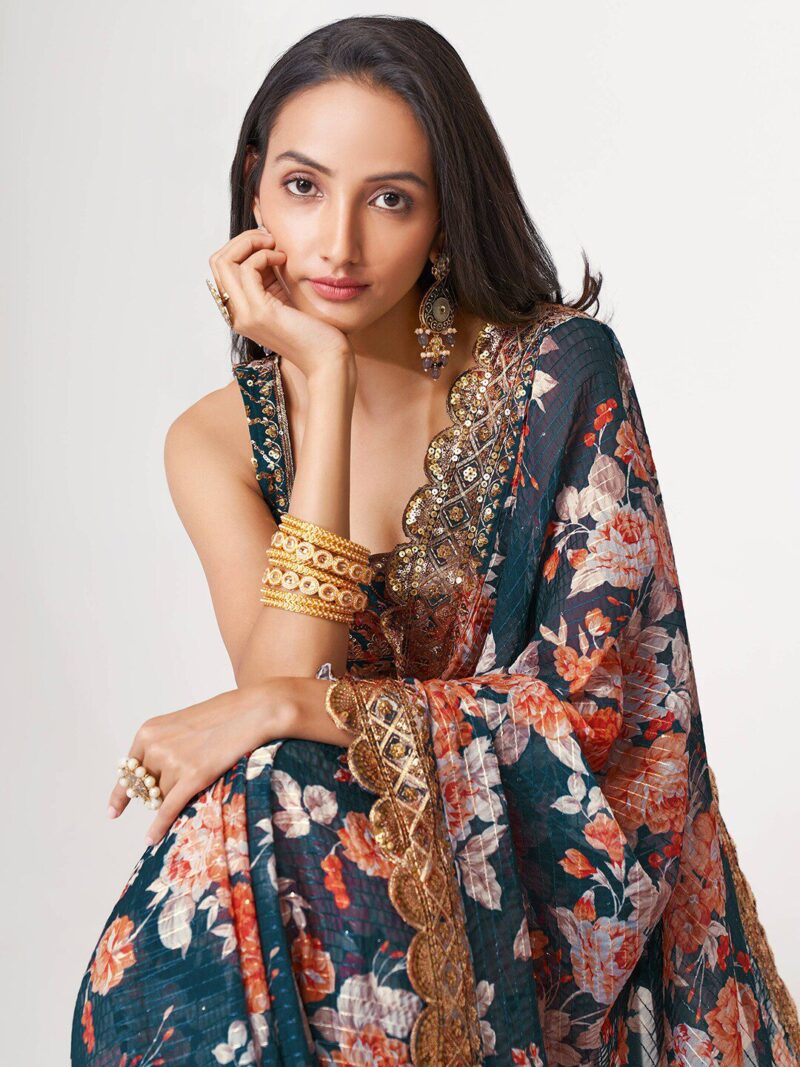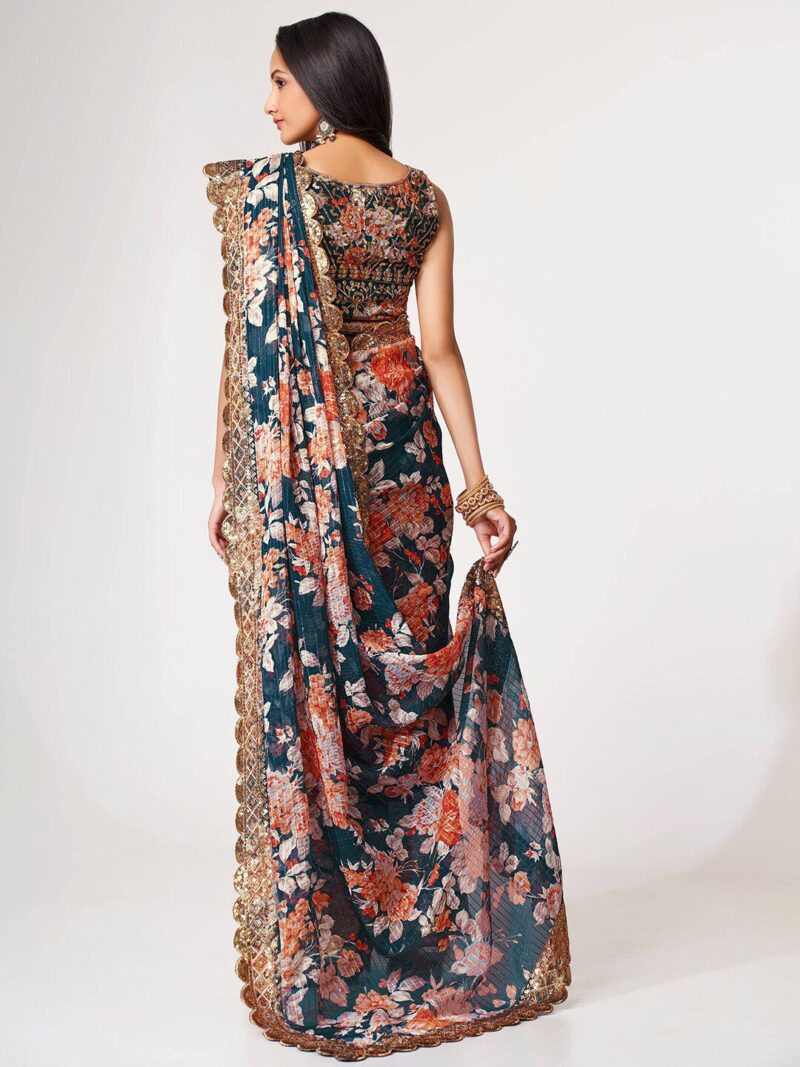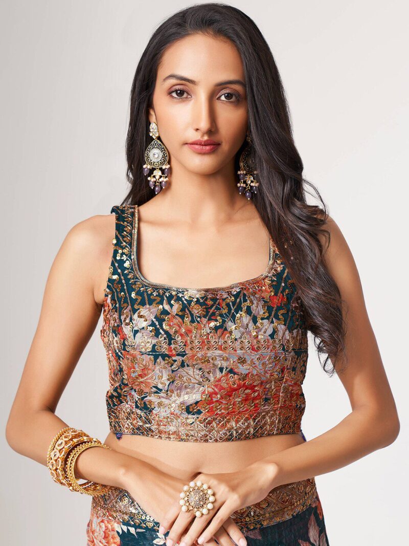 The blouse worn by the model might be for modelling purpose only. Check the image of the blouse piece to understand how the actual blouse piece looks like.