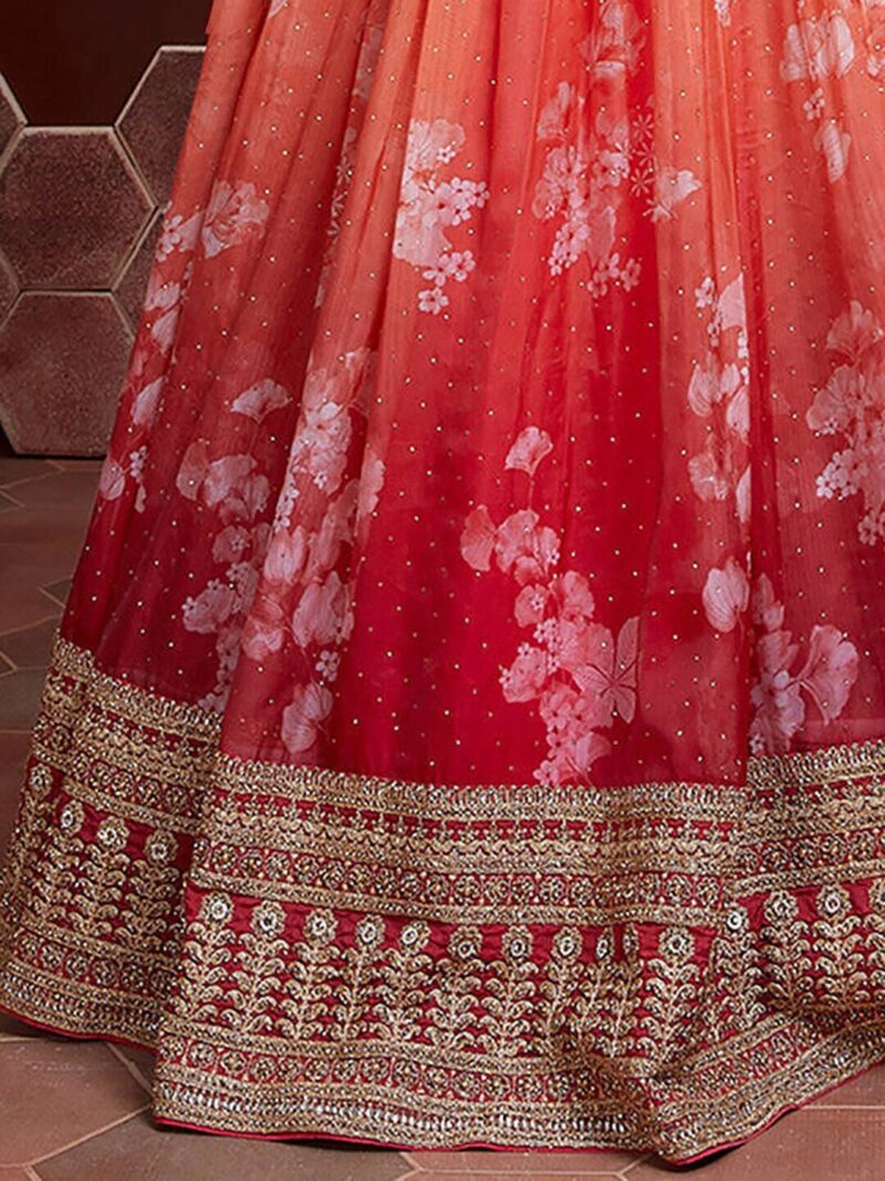 Orange and pink embellished unstitched blouse, has a square neck, sleeveless, orange and pink printed semi-stitched lehenga, flared hem